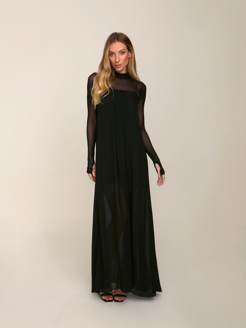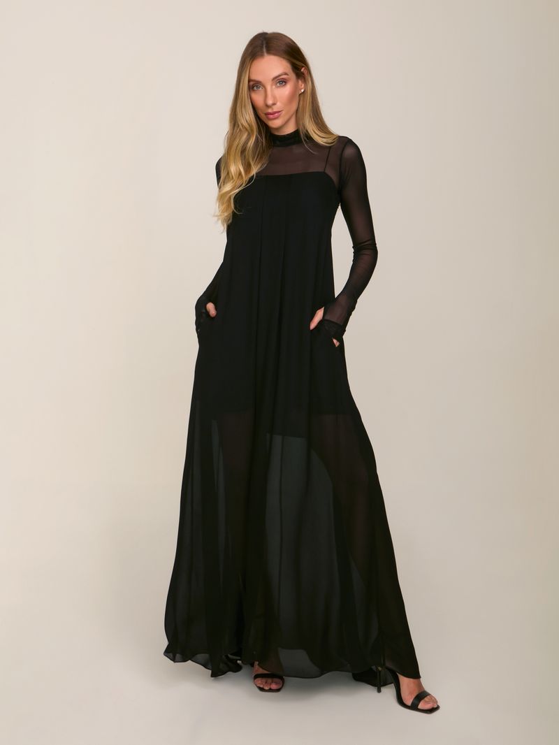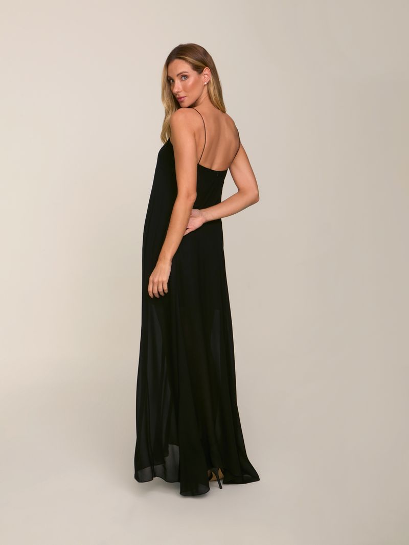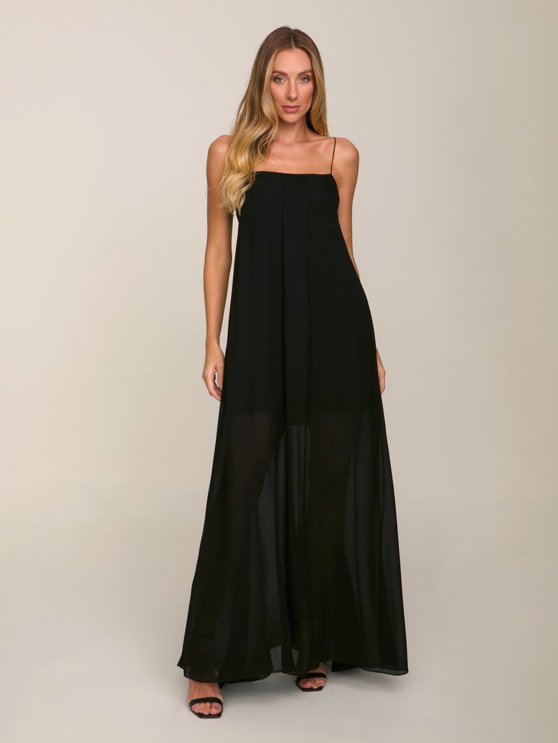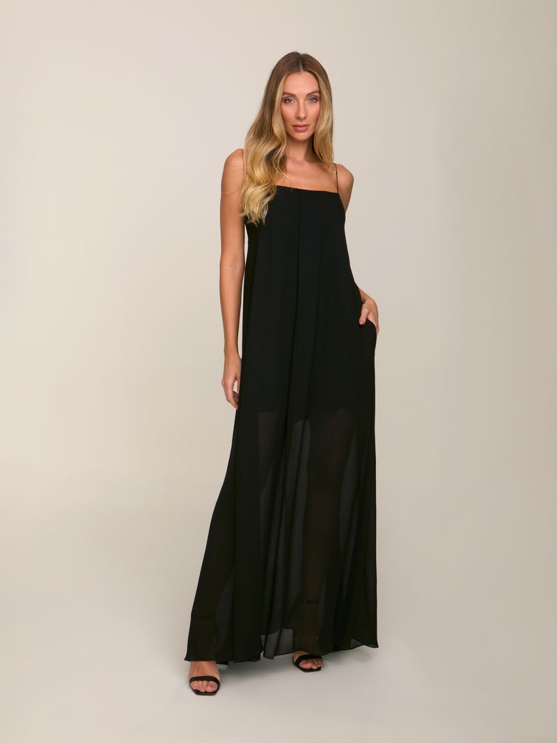 Vestido longo confeccionado em georgette, fluído com leve transparência. Modelagem solta, decote quadrado, prega frontal e alças finas. Possui bolsos nas laterais e forro. Fechamento por zíper nas costas.