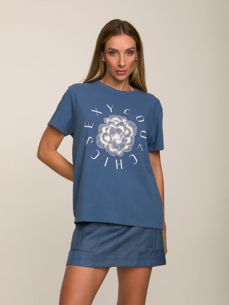 T-shirt confeccionada em malha 100% algodão, com silk exclusivo frontal. Peça com shape regular e manga curta. Detalhe de gola arredondada e rib canelada com leve puído.
