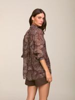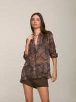 Camisa confeccionada em georgette com estampa exclusiva Mushroom Shell. Modelagem levemente ajustada ao corpo e manga longa com fechamento no punho e botão forrado no mesmo tecido. Detalhe de nervuras e prega nas costas. Fechamento frontal por botões.