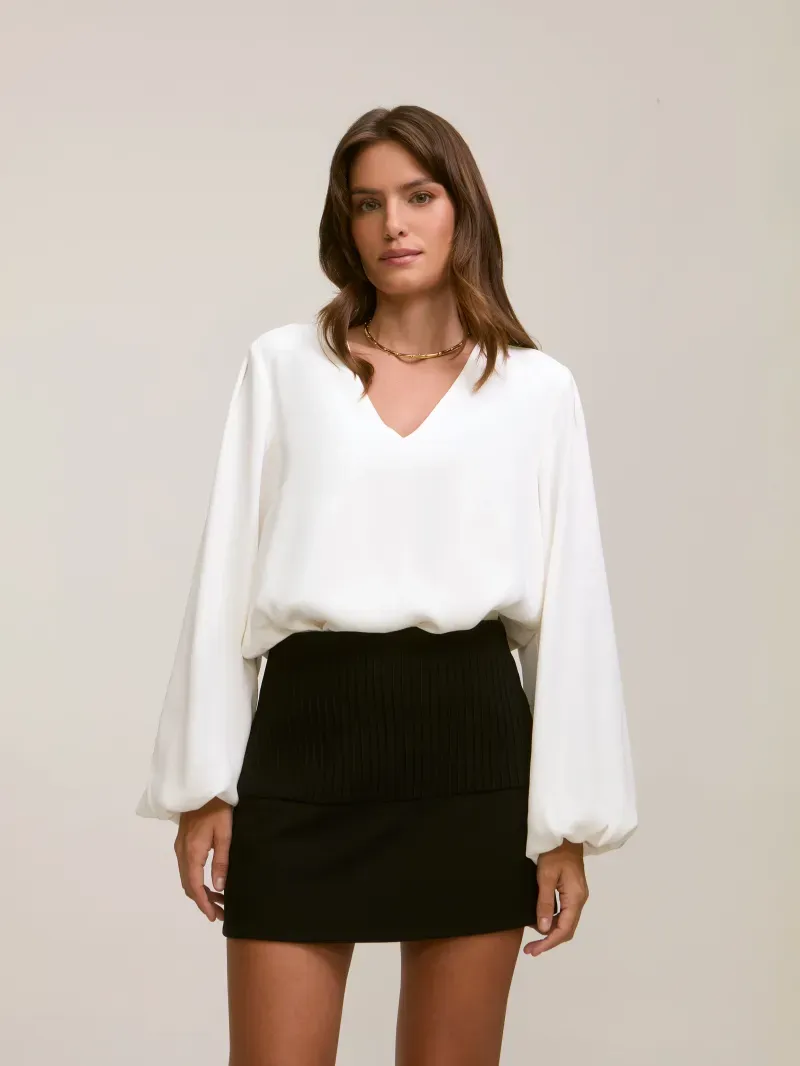 Short Saia confeccionado em crepe patou com corte de alfaiataria. Possui comprimento curto, cintura alta e detalhe de nervuras. Fechamento por zíper nas costas.