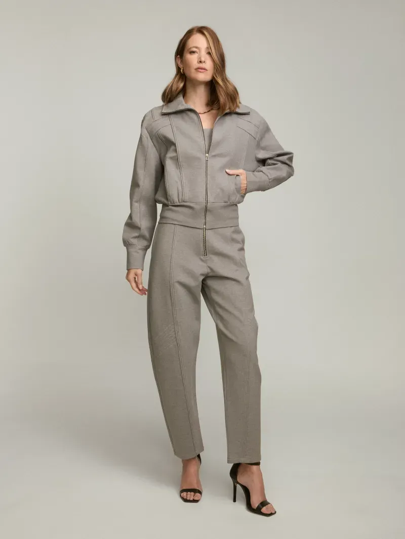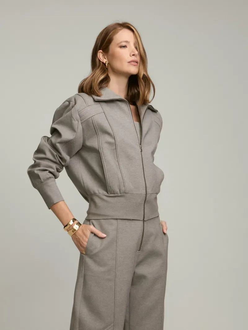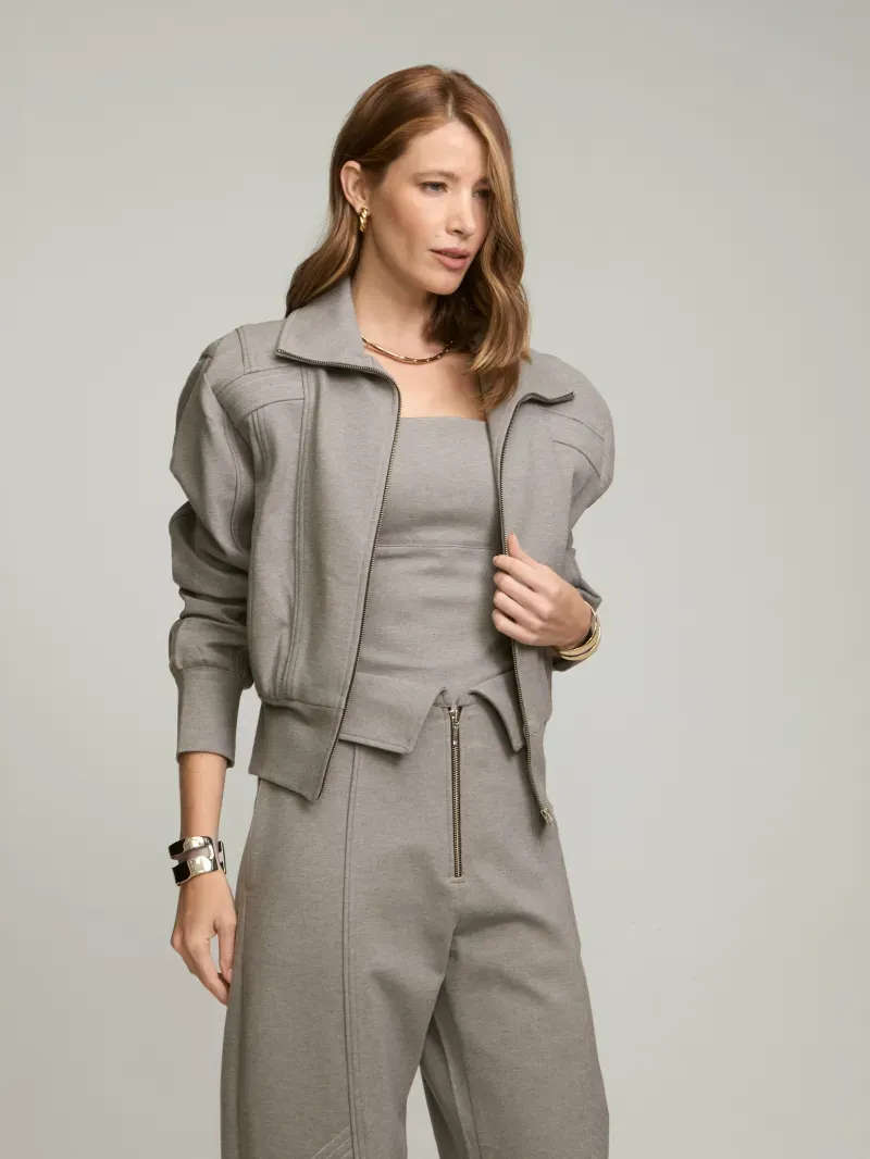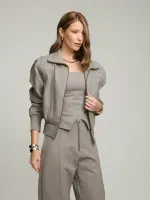 Jaqueta confeccionada em malha de alta gramatura e inteira forrada. Possui modelagem ampla e estruturada e ombreira removível. Detalhe de recortes, elástico no punho e na barra e bolsos frontais. Fechamento frontal por zíper.