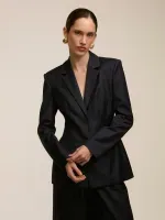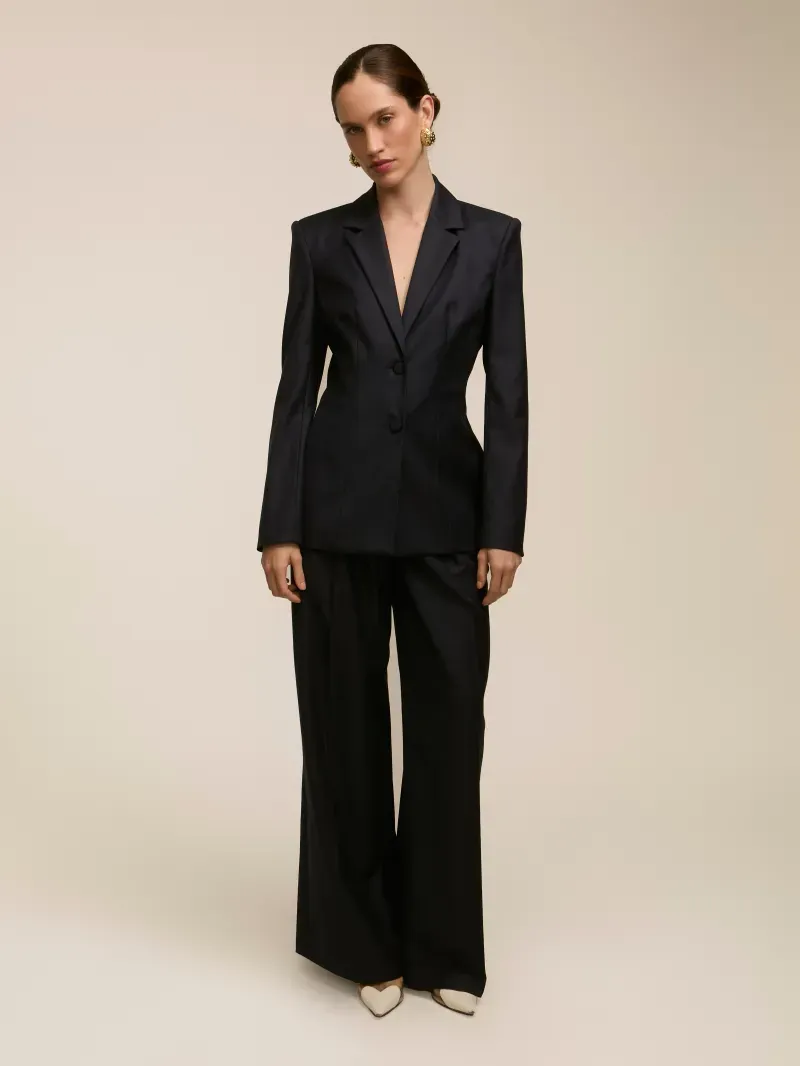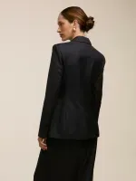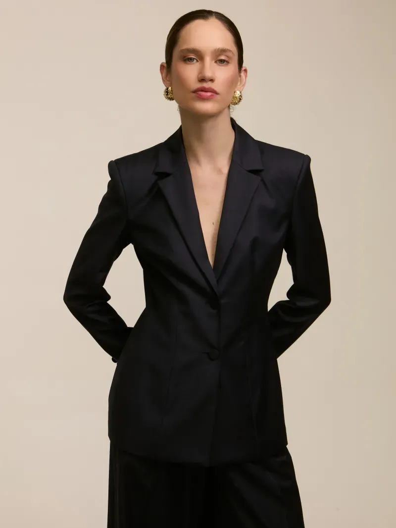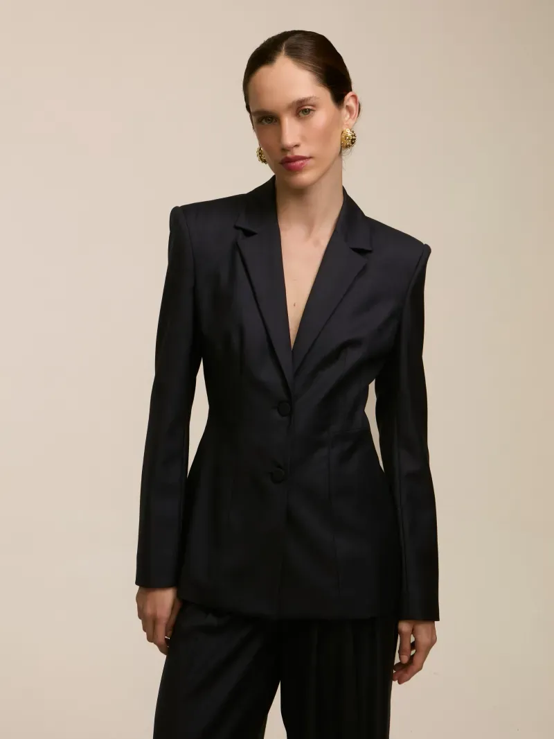 Blazer confeccionado em tecido gabardine 100% lã. Possui corte de alfaiataria, pences que deixam o shape acinturado. Manga longa com elástico interno e ombreiras fixas. Fechamento por botão frontal forrado no mesmo tecido e botões nas mangas. Peça completamente forrada.