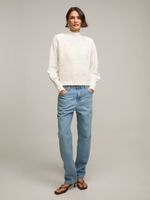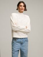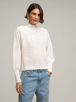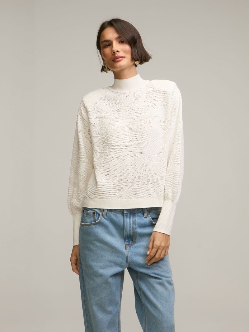 Blusa confeccionada em tricot com padronagem Mushroom Shell. Modelagem reta com leve transparência. Possui ombreira removível, gola alta e punho canelado.