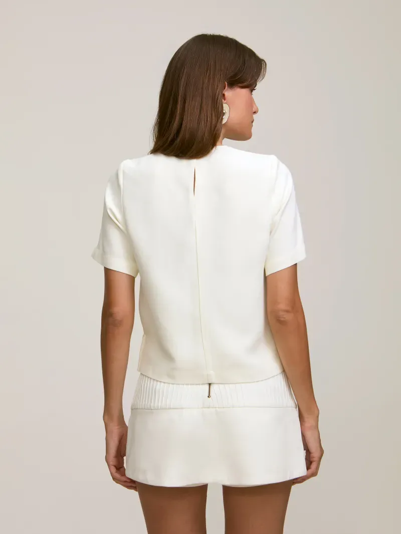 Blusa confeccionada em crepe patou. Possui corte de alfaiataria reto e modelagem clássica levemente solta ao corpo. Decote redondo, manga curta e detalhe lateral de fenda. Fechamento nas costas por botão no mesmo tecido.