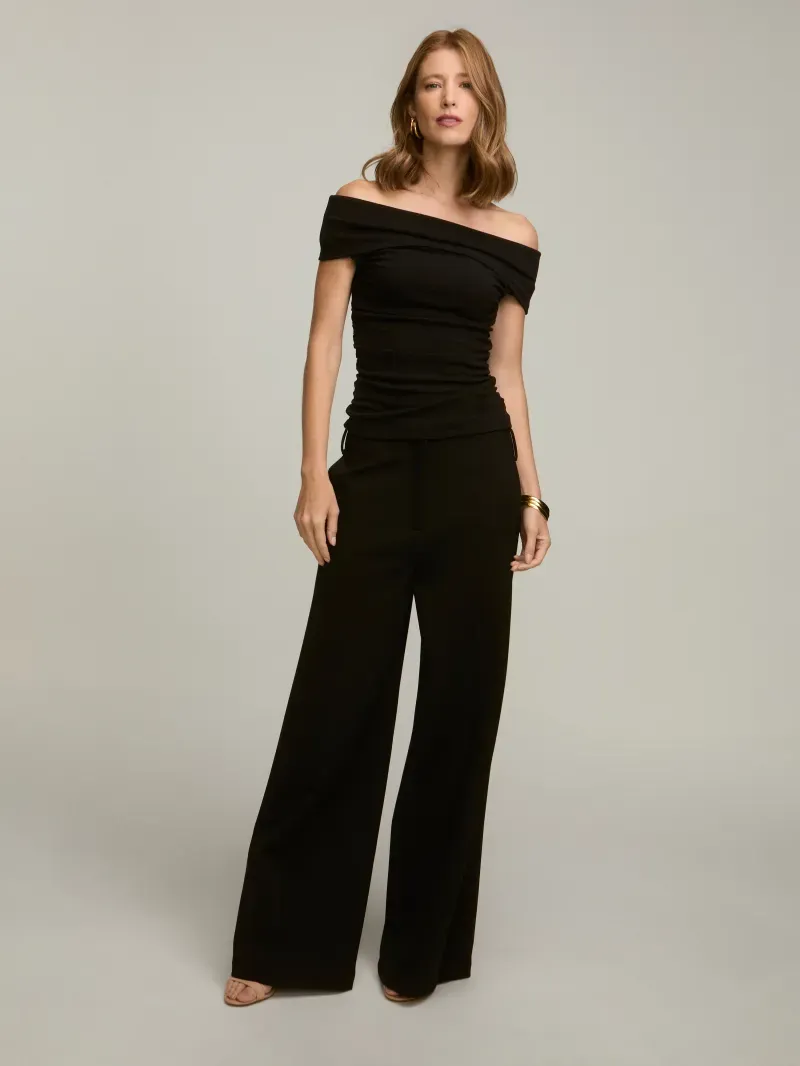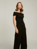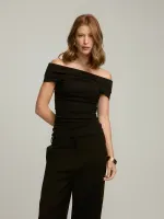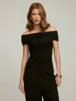 Blusa ombro a ombro confeccionada em malha. Possui shape ajustado ao corpo e decote reto. Detalhe de franzidos. Peça completamente forrada.