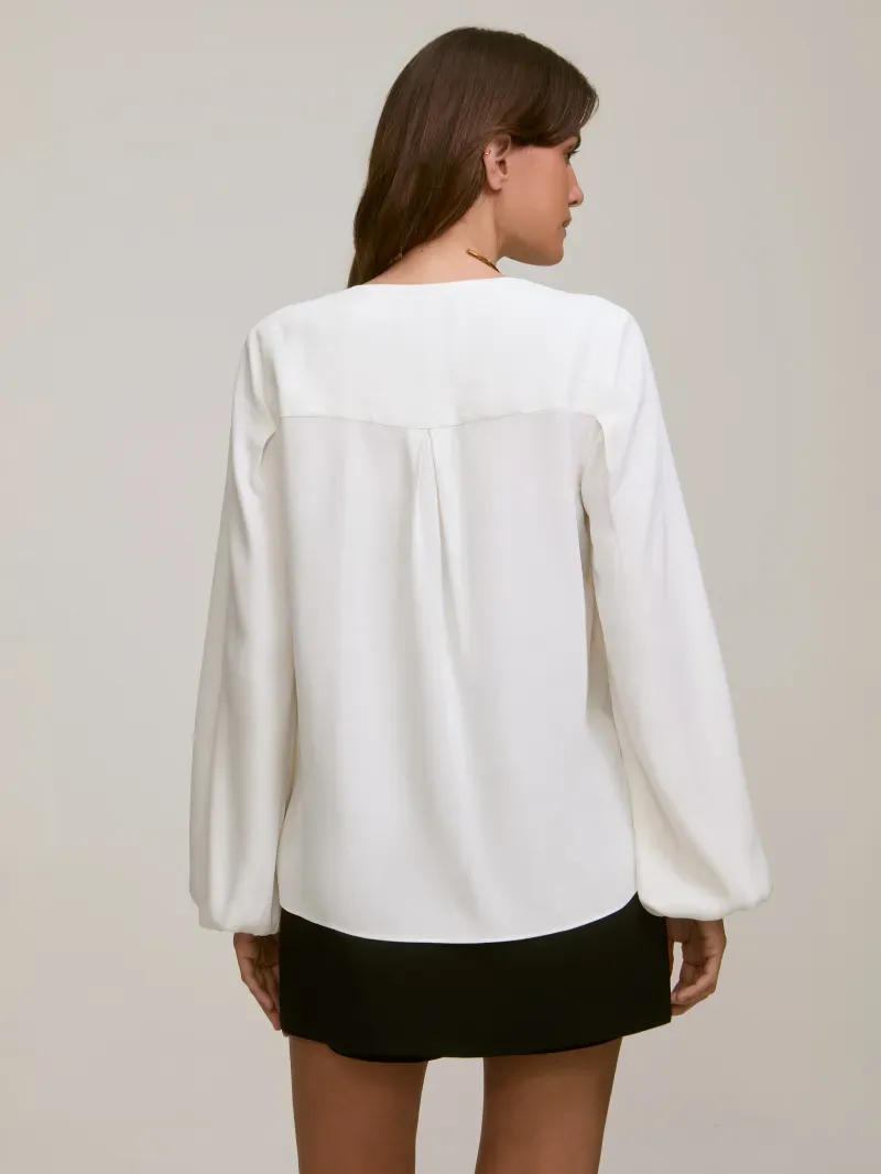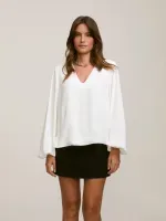 Blusa lisa confeccionada em tecido de crepe. Possui corte de alfaiataria e modelagem solta ao corpo, decote em v . Manga longa levemente bufante com pregas e elástico no punho para ajuste de altura.