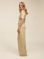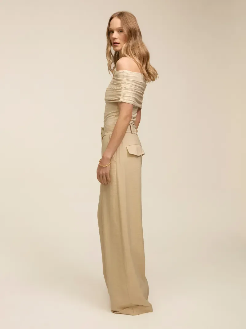 Blusa confeccionada em malha gelada. Possui modelagem ombro a ombro e forro. Detalhe de drapeados.