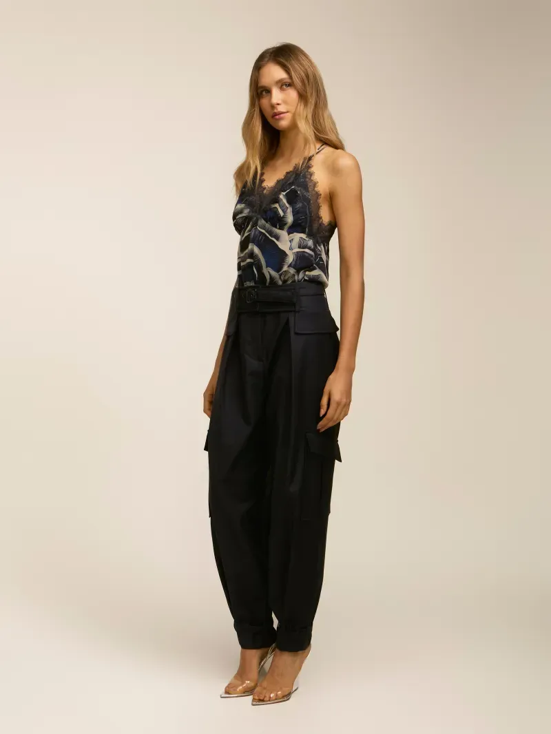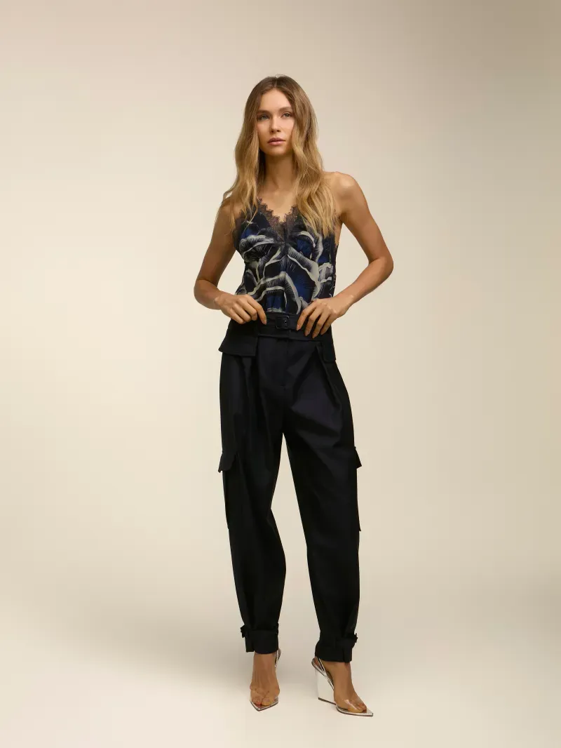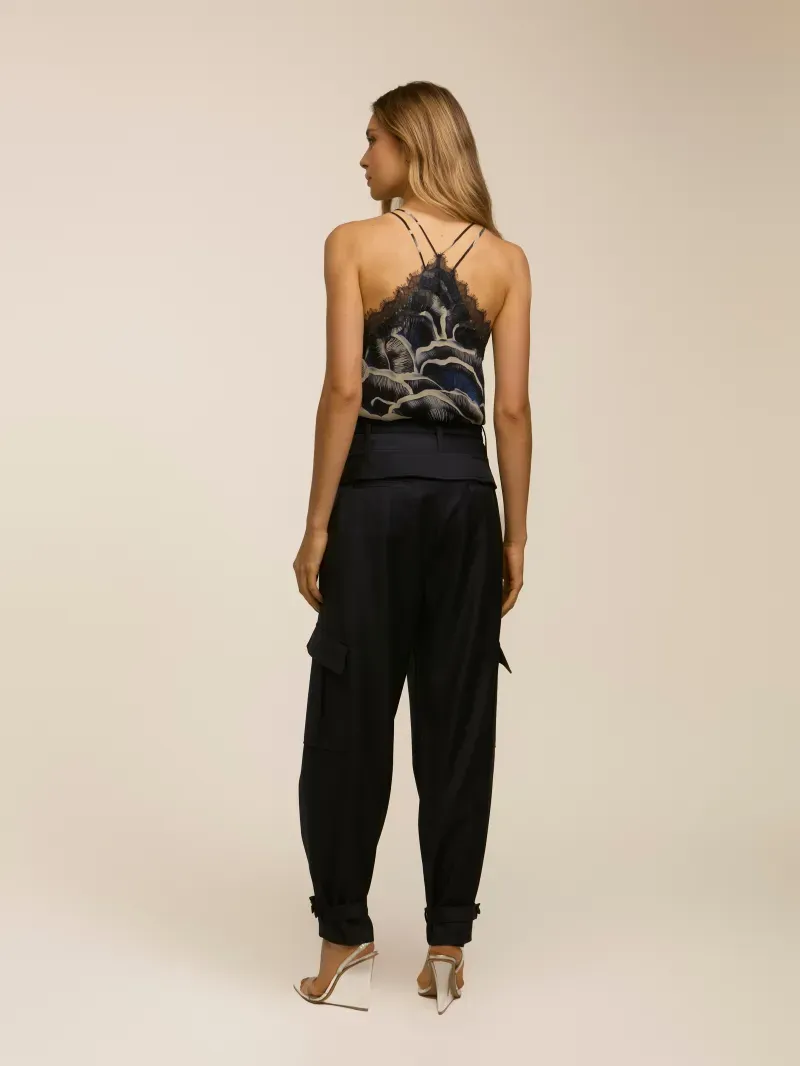 Calça confeccionada em tecido 100% lã. Modelagem cargo com bolsos nas laterais e lapela nas costas. Fechamento por colchetes, botão e zíper. Acompanha faixa removível com fechamento por botão na barra e cinto para sobreposição.