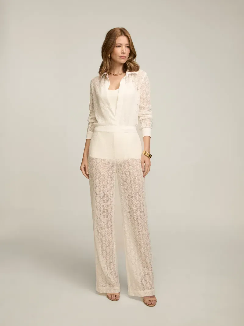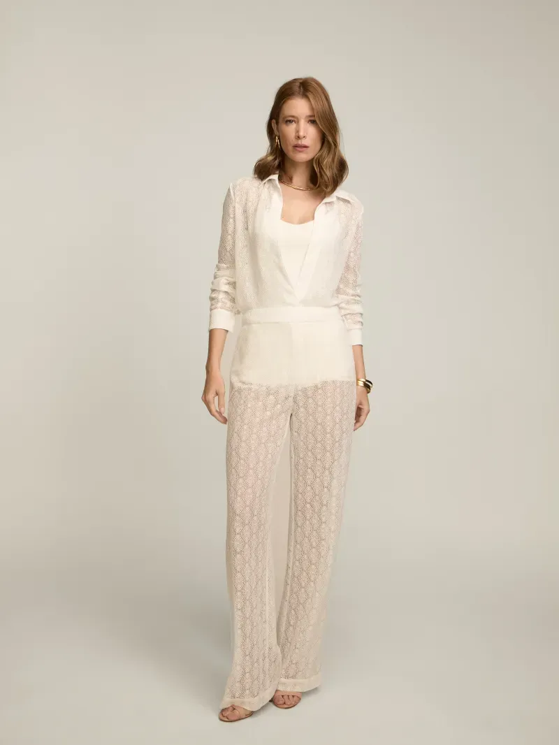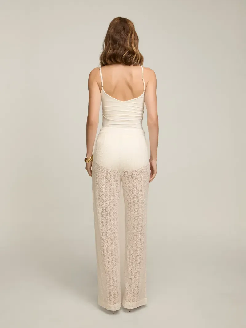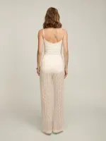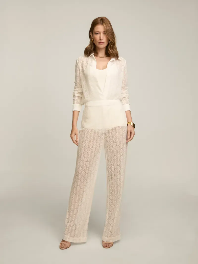 Calça confeccionada em renda. Possui modelagem reta e cintura alta. Fechamento por zíper na lateral.
