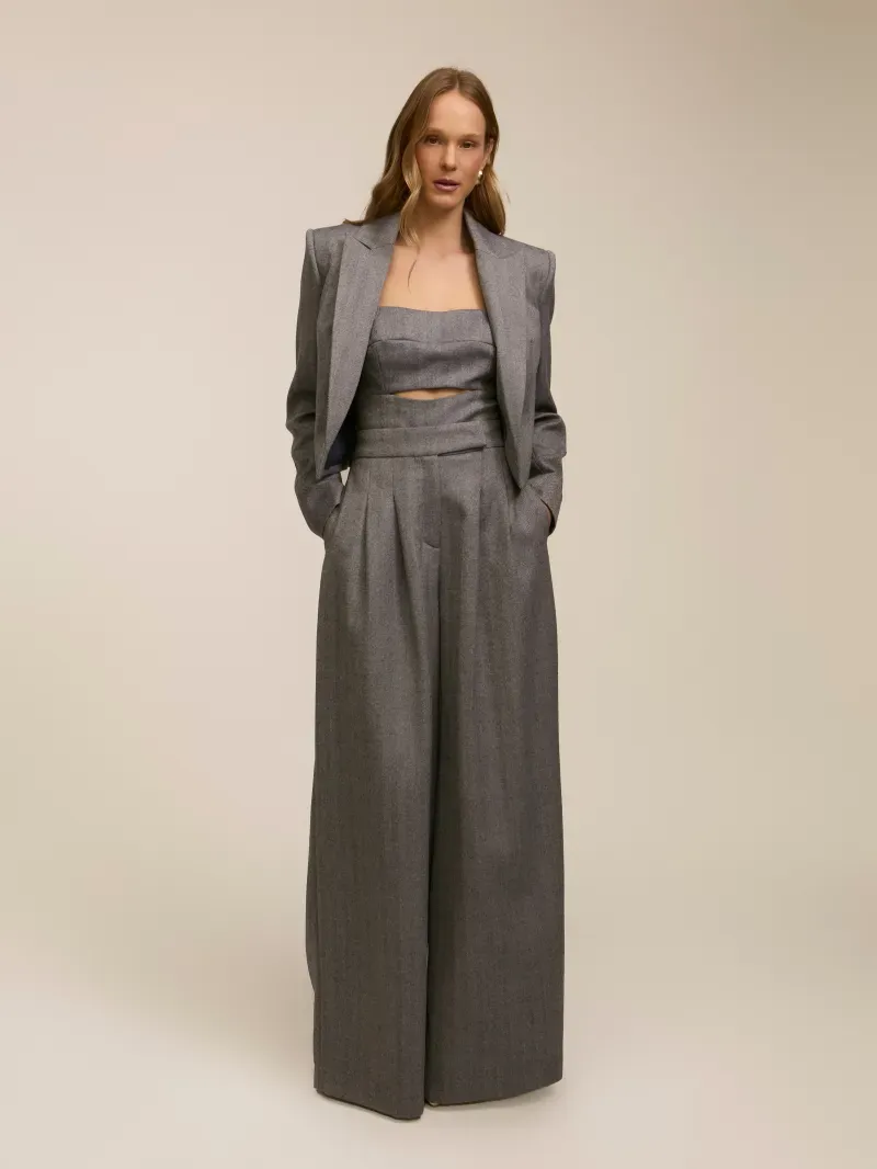 Calça pantalona confeccionada em tecido 100% lã. Possui padronagem de "espinha de peixe", cintura alta e pregas centrais. Bolsos frontais e lapela nas costas. Fechamento por colchete, botão e zíper.
