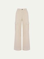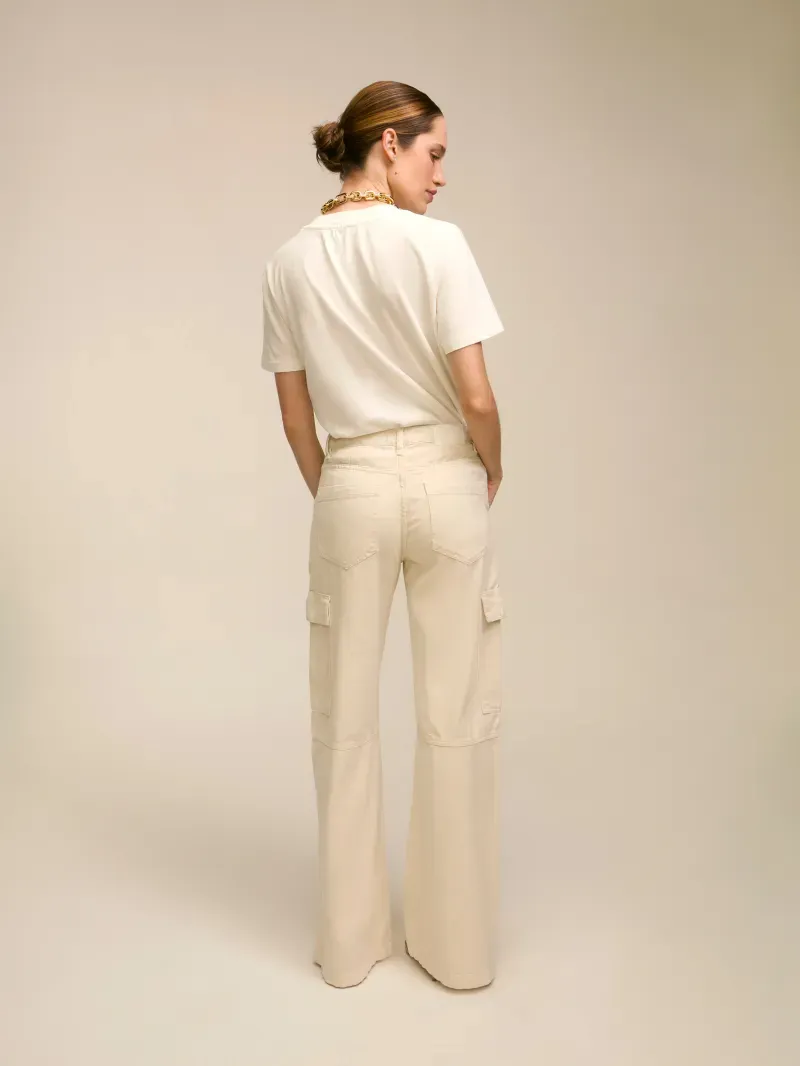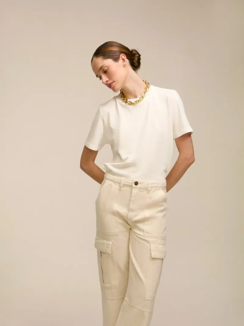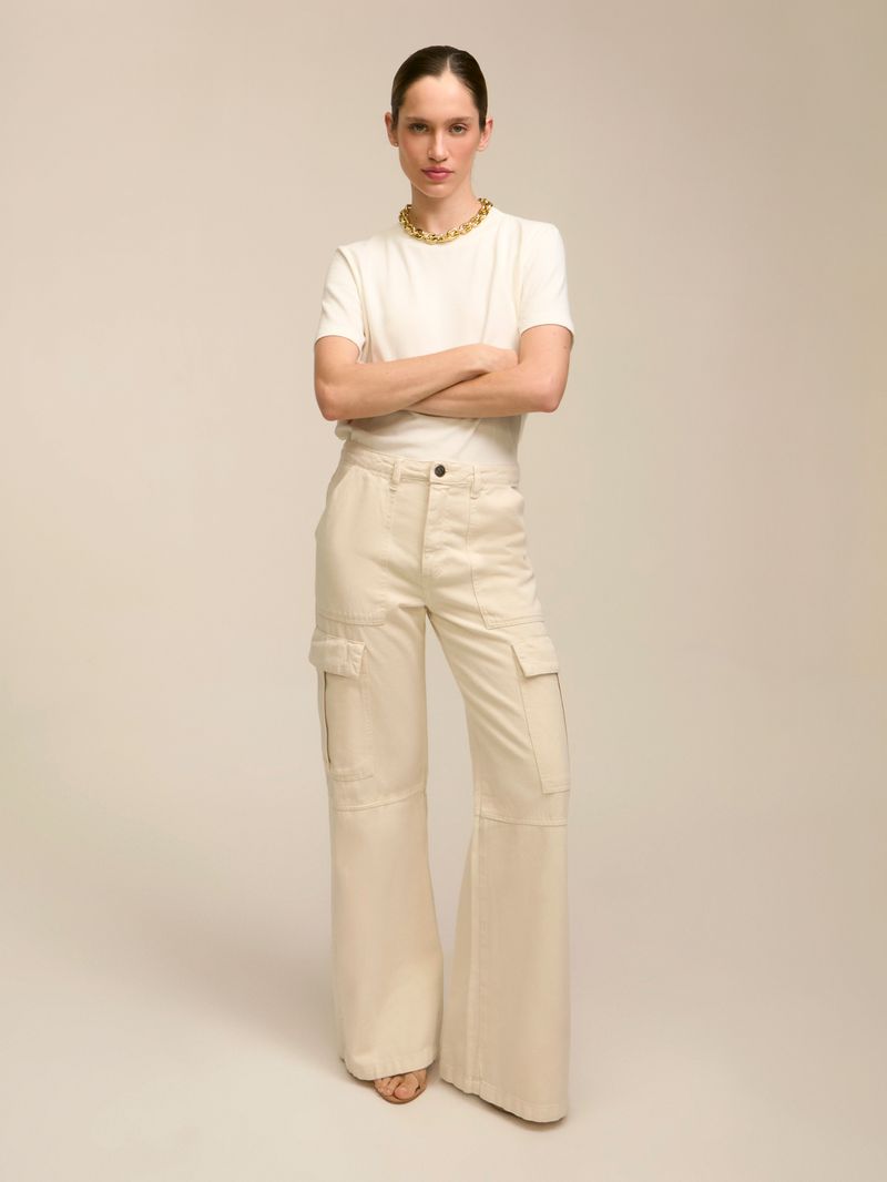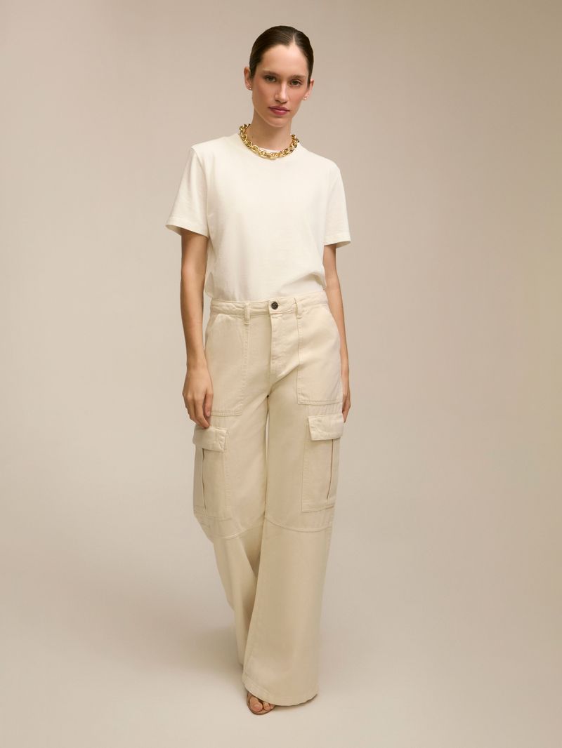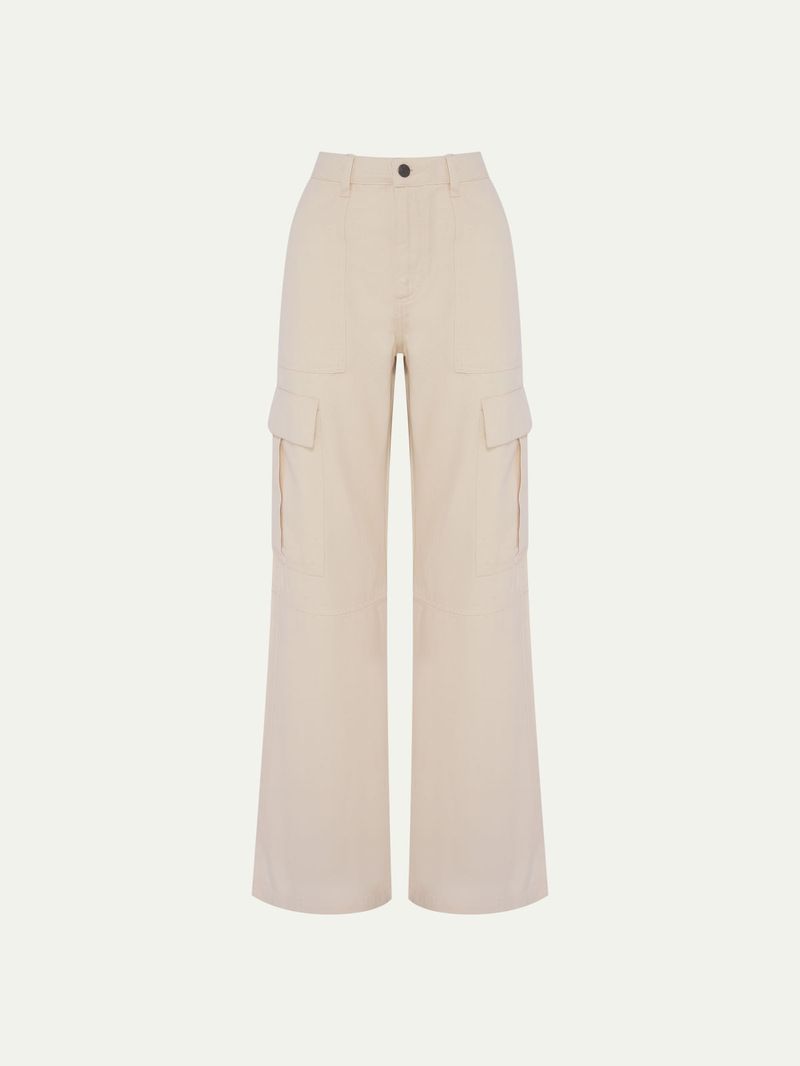 Calça confecionada em jeans 100% algodão. Possui modelagem cargo, cintura média com caimento reto. Detalhe da barra levemente aberta e bolsos laterais. Fechamento em zíper e botão frontal.