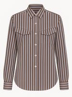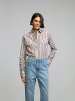 Camisa listrada confeccionada em tricoline. Modelagem regular levemente acinturada, mangas longas com fechamento no punho e botões frontais. Possui bolsos laterais e gola estruturada.