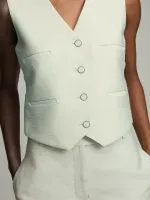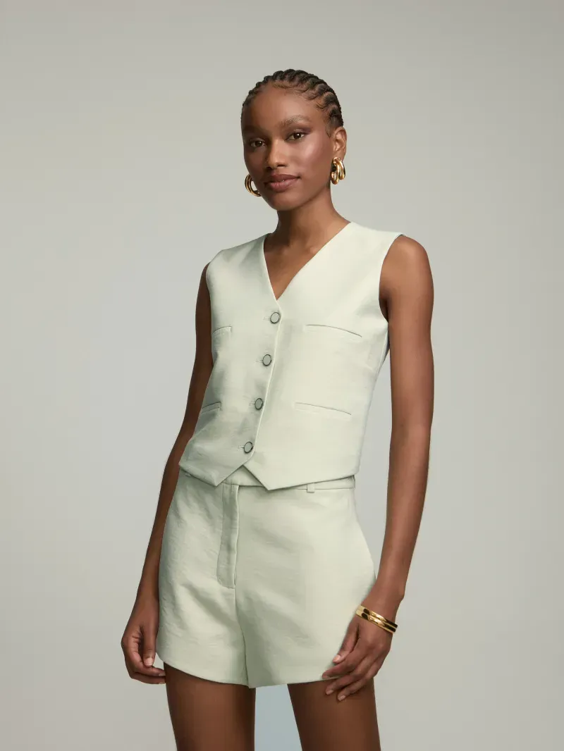 Colete confeccionado em tecido de alfaiataria. Modelagem reta, curta e decote v. Possui lapelas frontais. Fechamento por botões esmaltados. Peça completamente forrada.