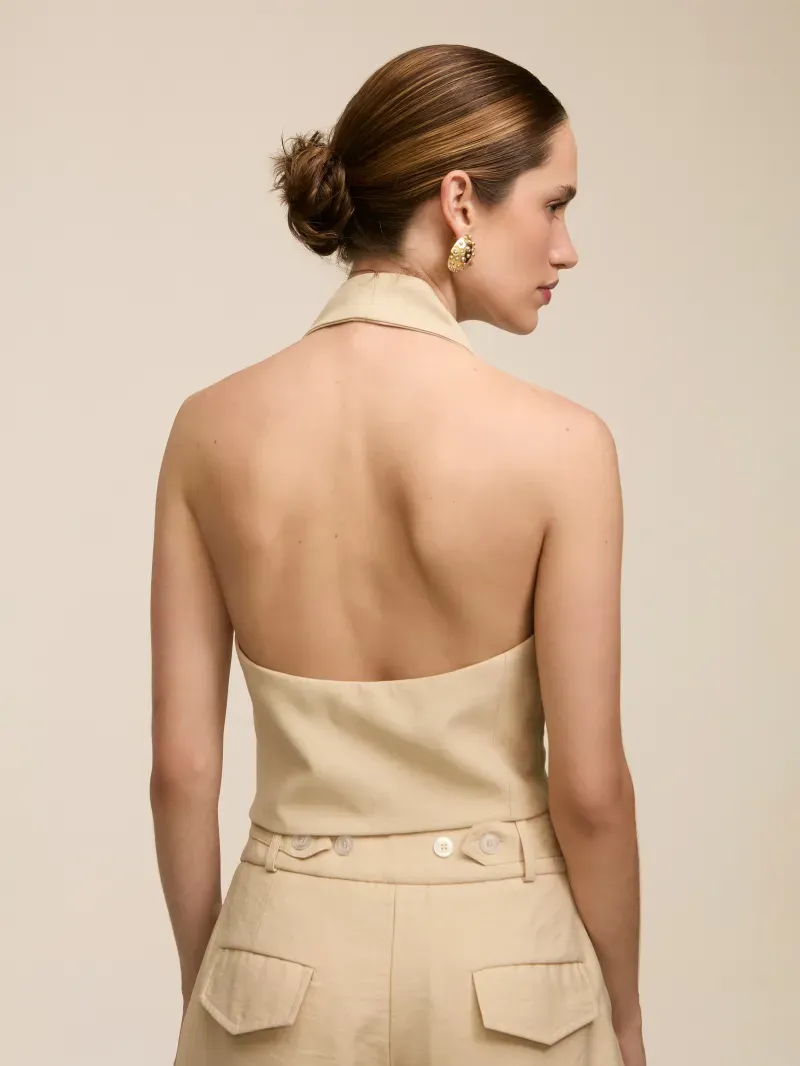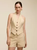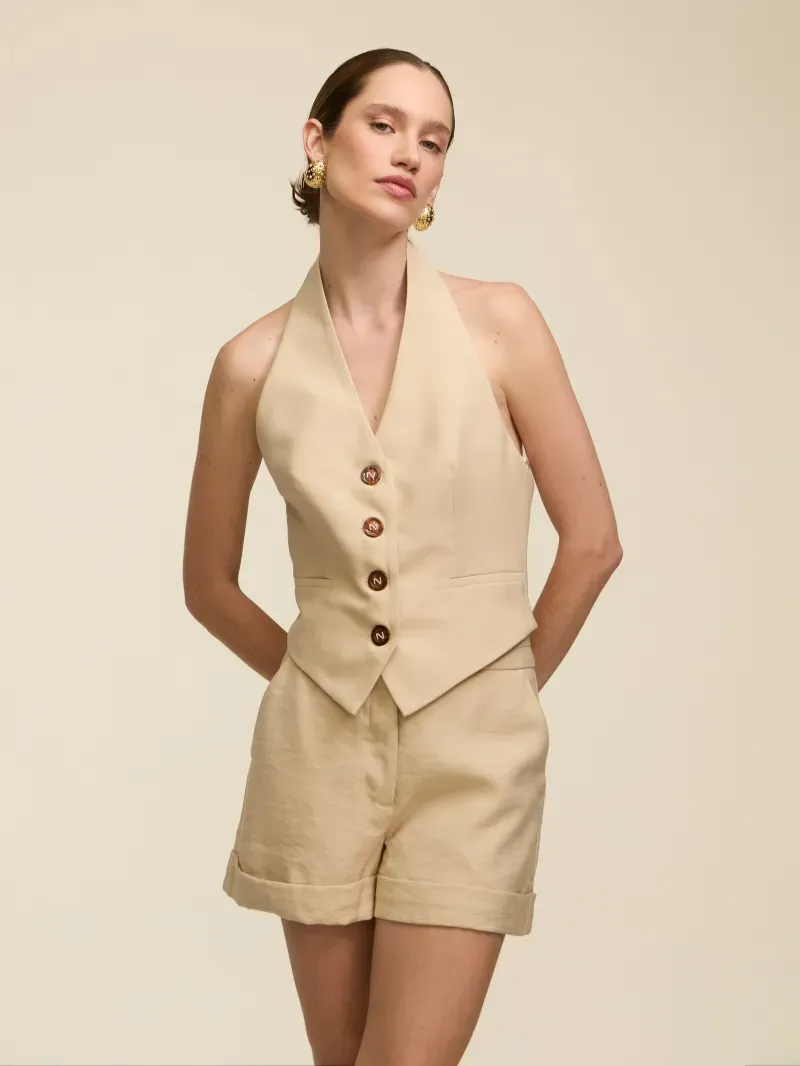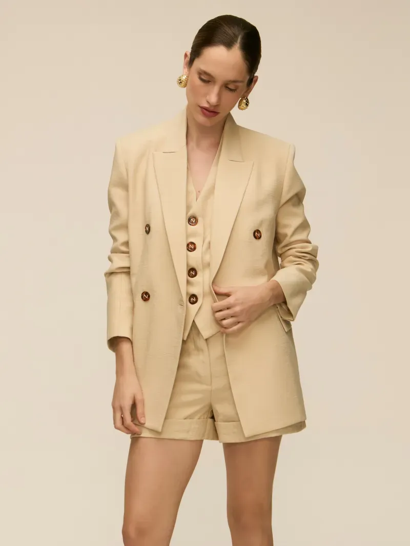 Colete confeccionado em tecido de alfaiataria, duplo e entretelado. Modelagem acinturada, textura com ranhuras, frente única com decote V e lapelas. Fechamento por botões tartaruga e bordados à mão com a letra N, que agregam sofisticação e acabamento artesanal à peça.