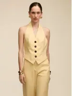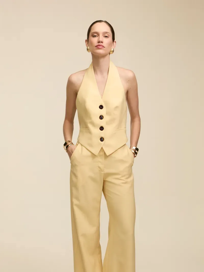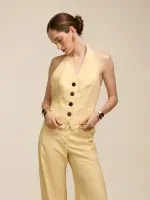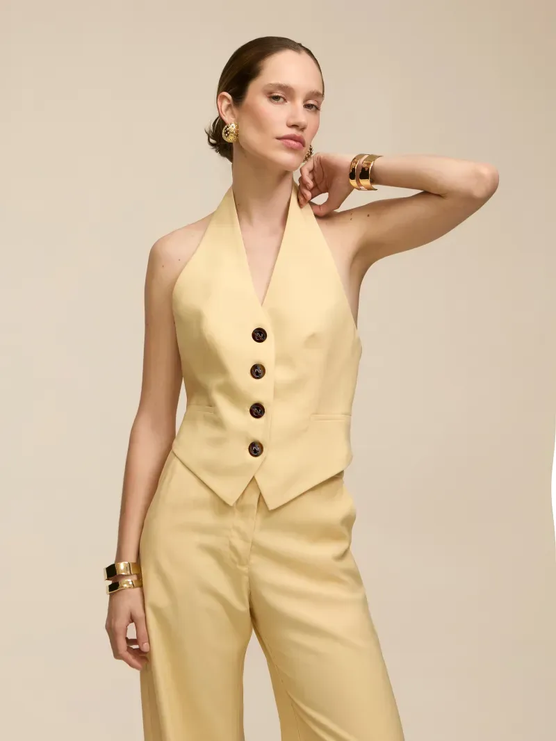 Colete confeccionado em tecido de alfaiataria, duplo e entretelado. Modelagem acinturada, textura com ranhuras, frente única com decote V e lapelas. Fechamento por botões tartaruga e bordados à mão com a letra N, que agregam sofisticação e acabamento artesanal à peça.