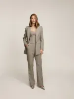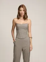 Corset confeccionado em tecido duplo de alfaiataria entretelado. Possui modelagem justa e parte frontal levemente alongada. Detalhes de barbatanas e elásticos nas costas, Fechamento por zíper.