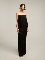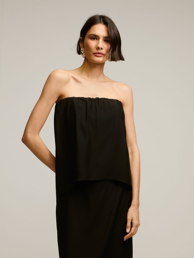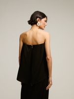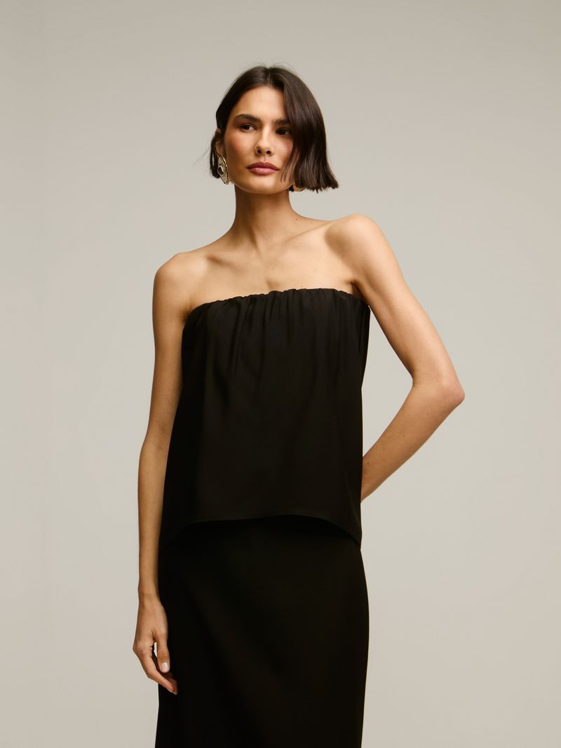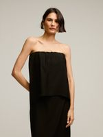 Corset confeccionado em crepe patou, inteiro duplo. Possui barbatanas e fechamento posterior nas costas. Sobreposição balone com parte superior de pregas e parte posterior alongada.