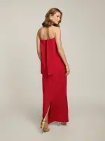 Corset confeccionado em crepe patou, inteiro duplo. Possui barbatanas e fechamento posterior nas costas. Sobreposição balone com parte superior de pregas e parte posterior alongada.