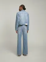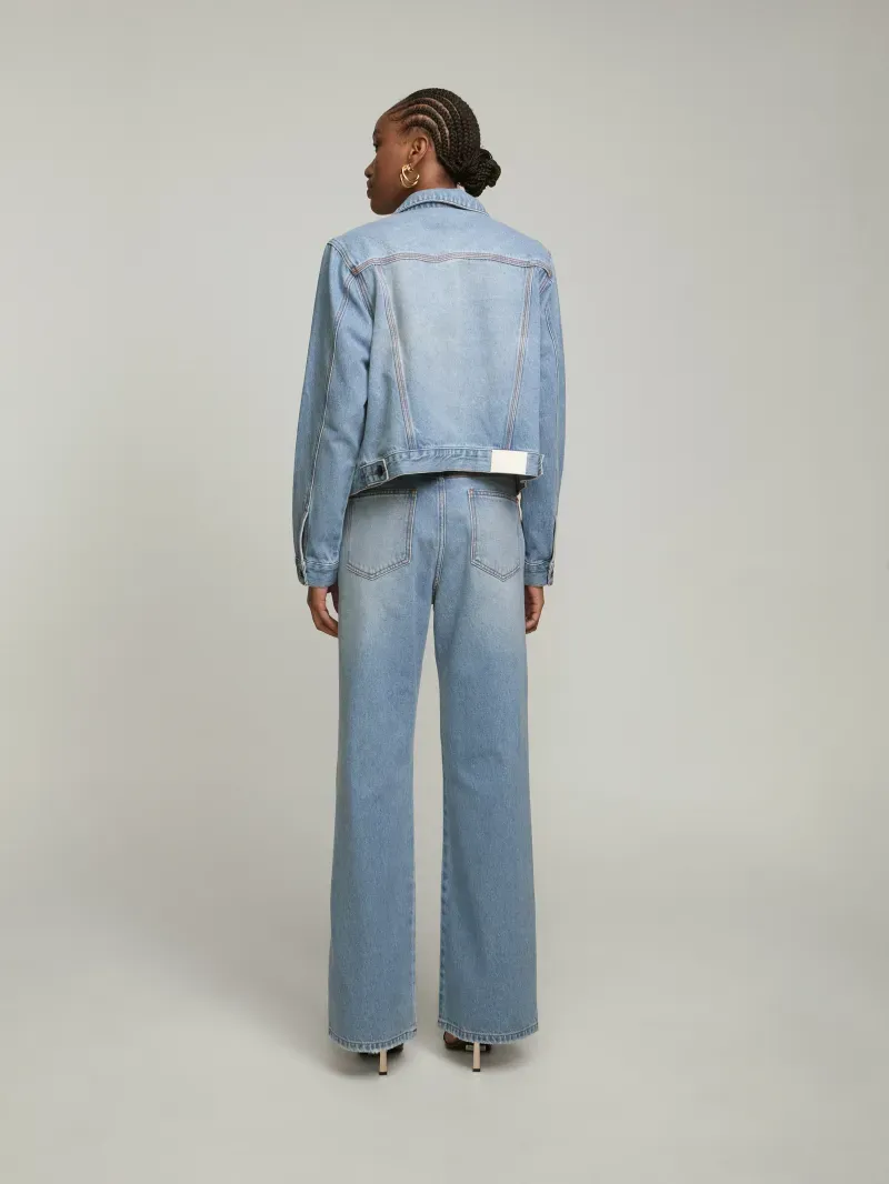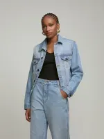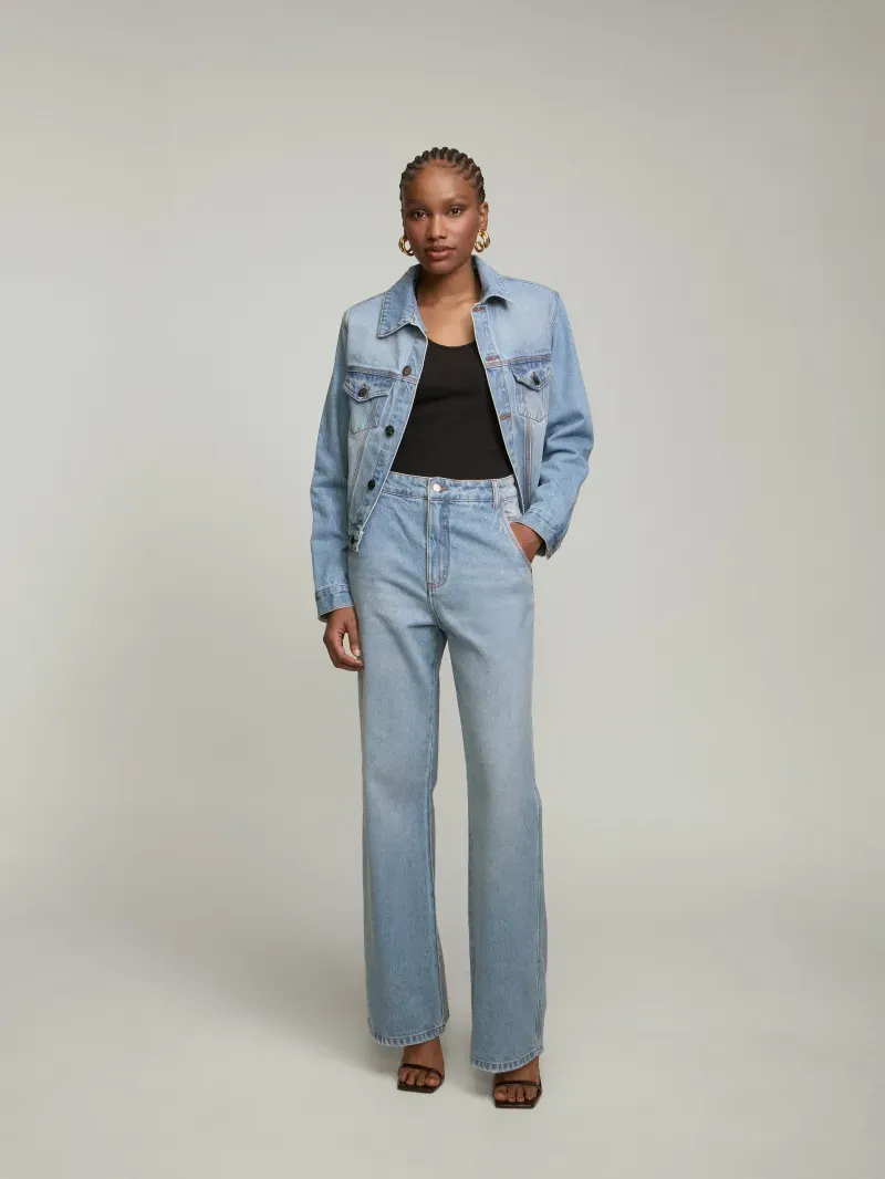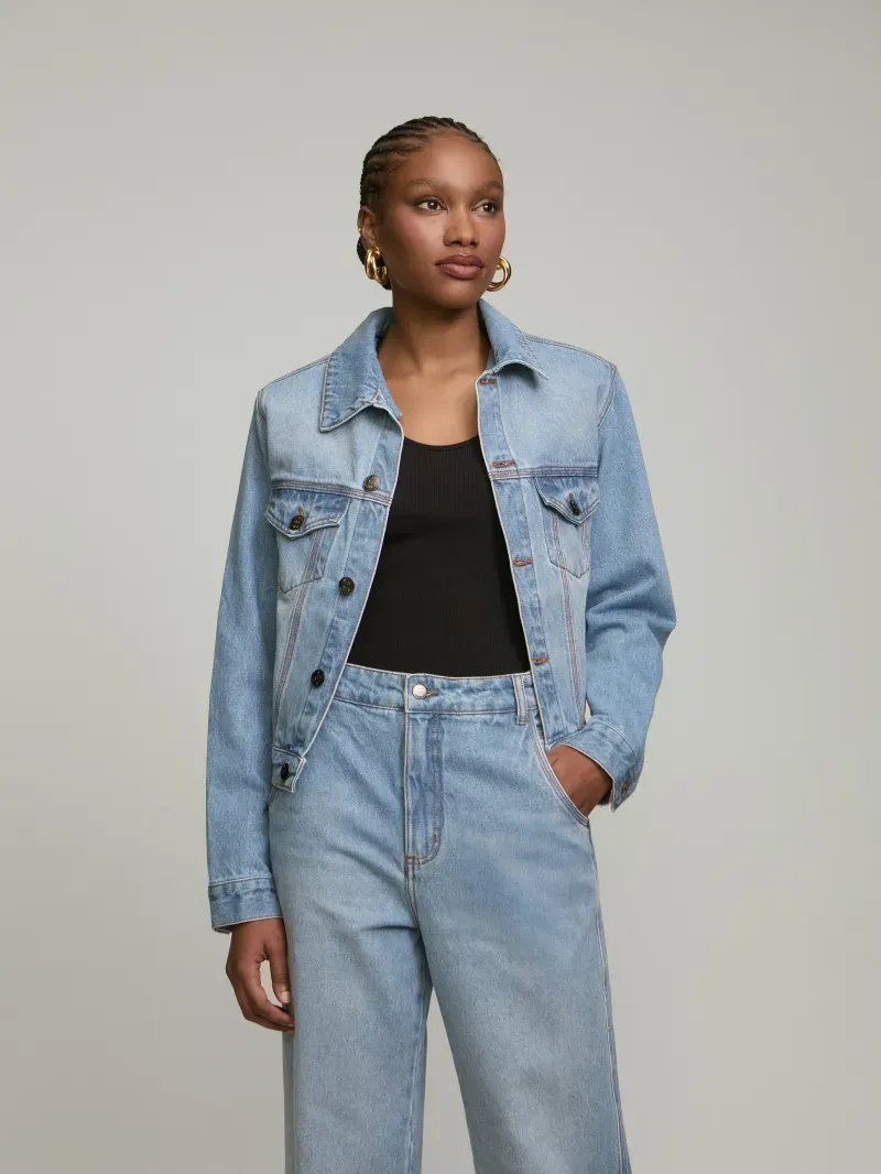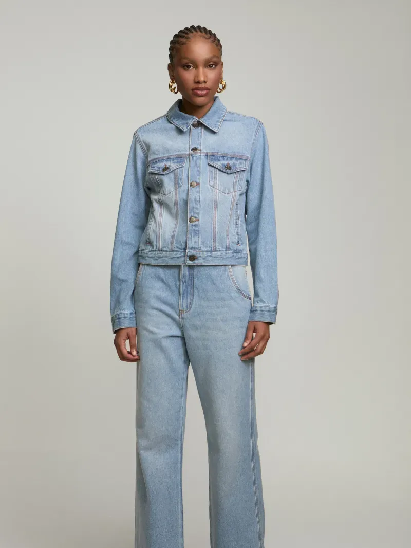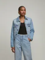 Jaqueta confeccionada em jeans. Possui modelagem reta, detalhe de pesponto triplo e bolsos frontais. Fechamento por botões.