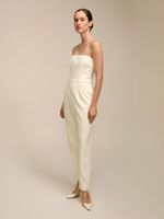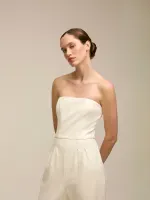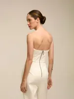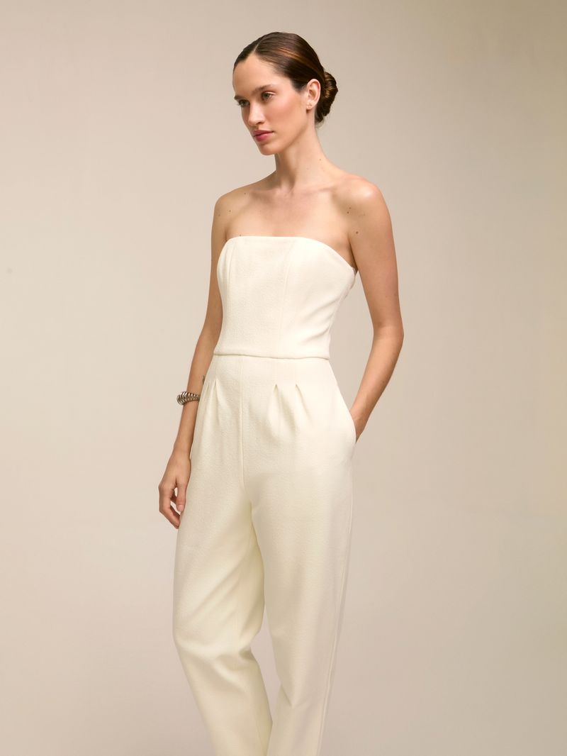 Jumpsuit confeccionado em tecido texturizado, com busto forrado. Possui modelagem e decote reto, bolsos frontais e pregas. Fechamento por zíper nas costas.