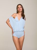 Maiô confeccionado em lycra. Possui parte superior com modelagem ampla e decote v. Detalhe de franzidos.