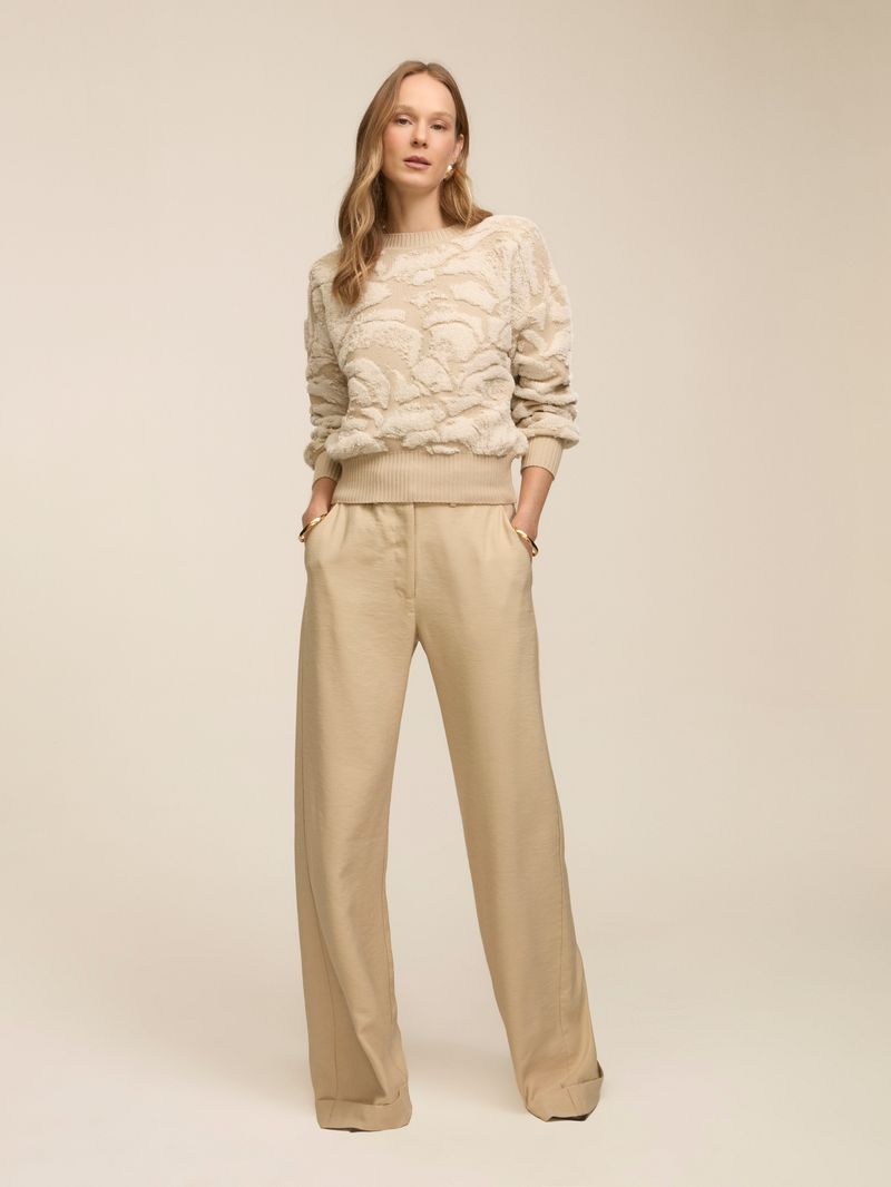 Pull confeccionado em tricot de jacquard na estampa exclusiva Mushroom Bloom. Modelagem quadrada com leve acinturado na barra. Possui mangas longas levemente bufantes, ombreiras e gola redonda.