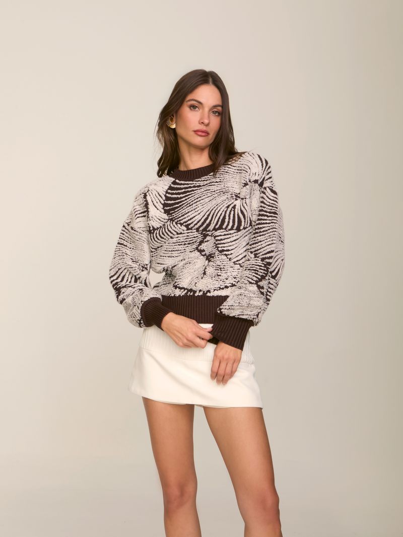 Pull confeccionado em tricot de jacquard na estampa exclusiva Mushroom Shell. Modelagem quadrada com leve acinturado na barra. Possui mangas longas levemente bufantes, ombreiras e gola redonda.