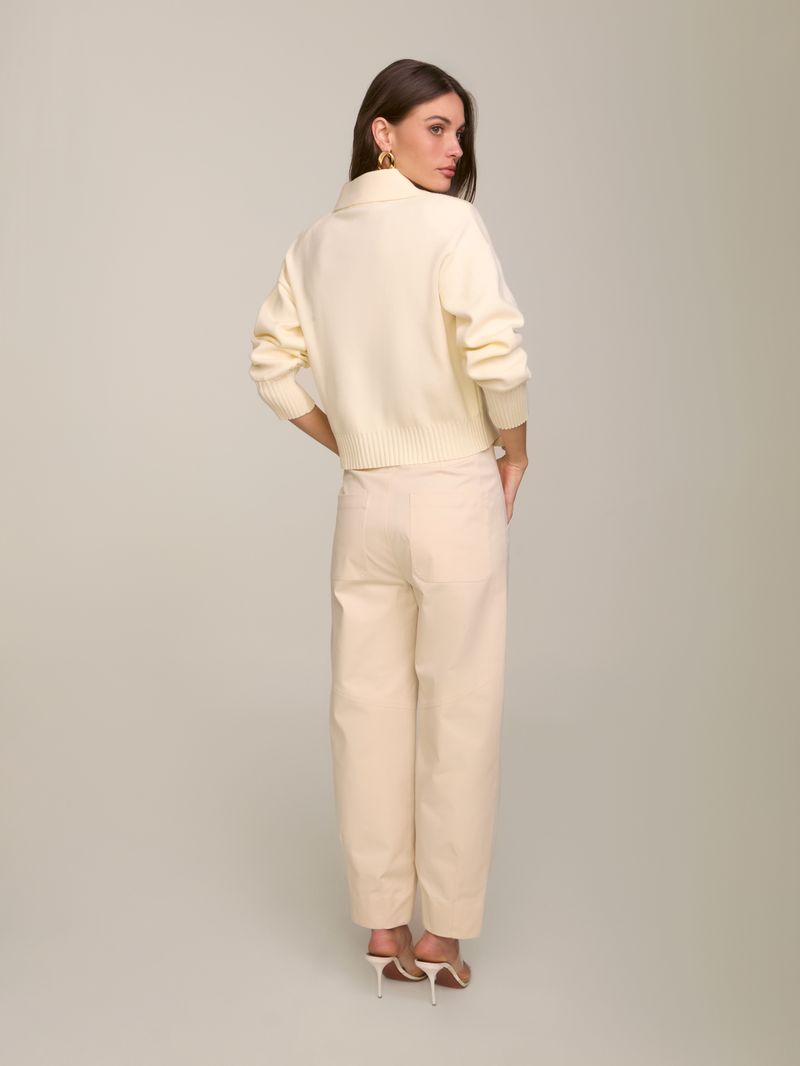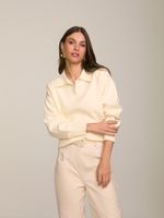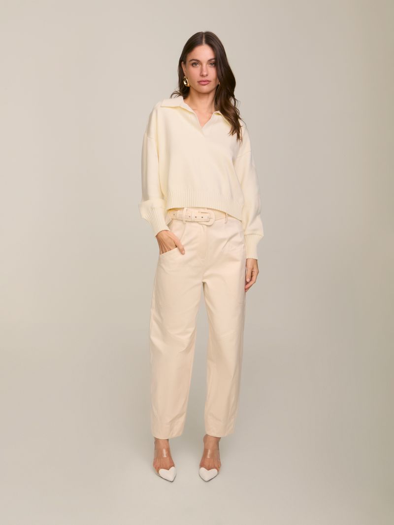 Pull confeccionado em tricot. Modelagem cropped quadrada e gola esporte. Possui manga longa levemente bufante, ombreira removível e detalhe de punho e barra canelada.