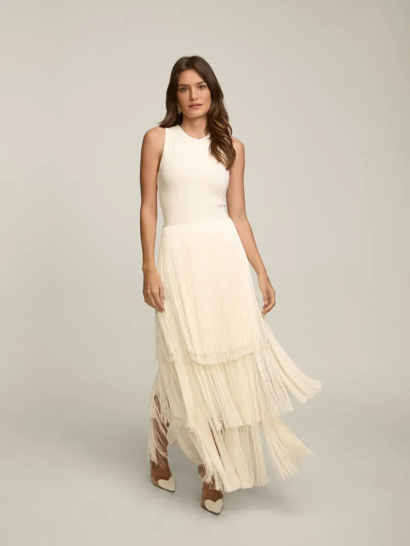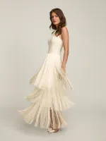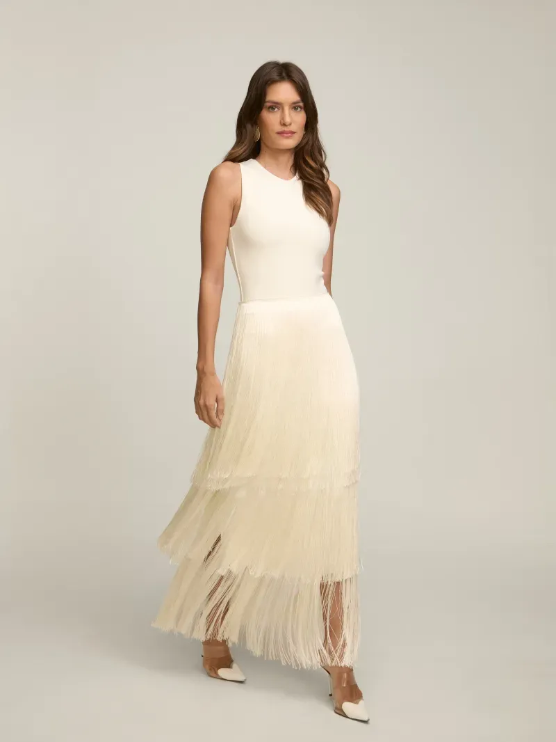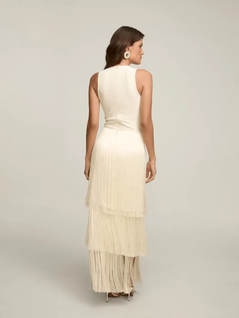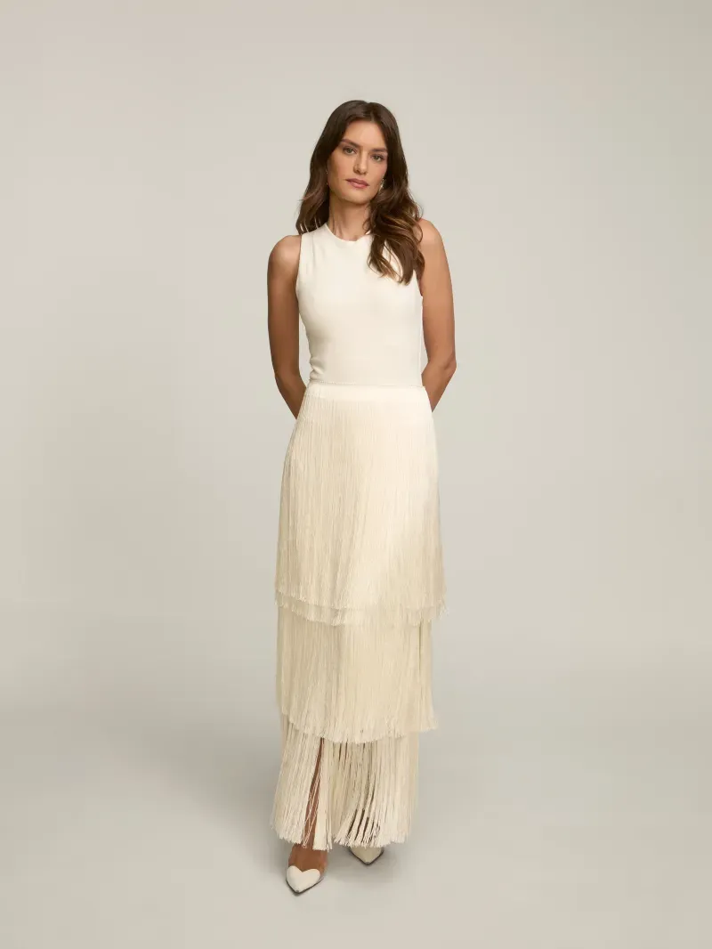 Saia confeccionada em crepe coberto por franjas em camadas. Possui cintura alta e fechamento por zíper nas costas.