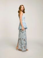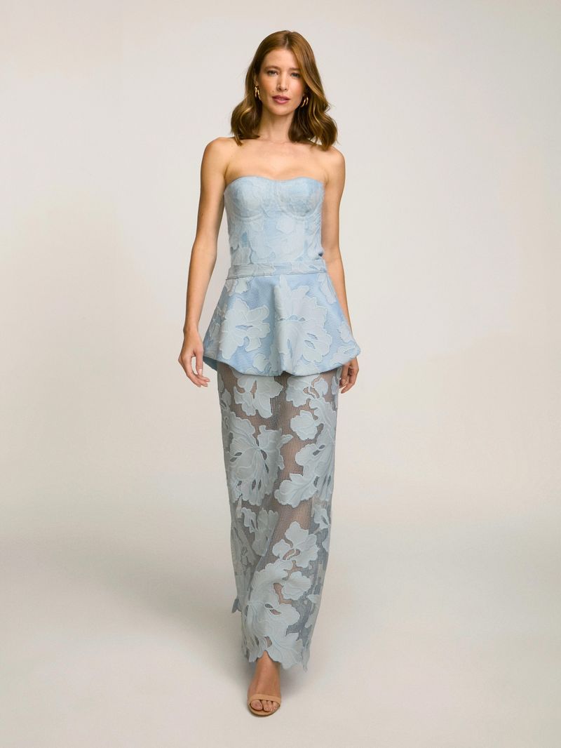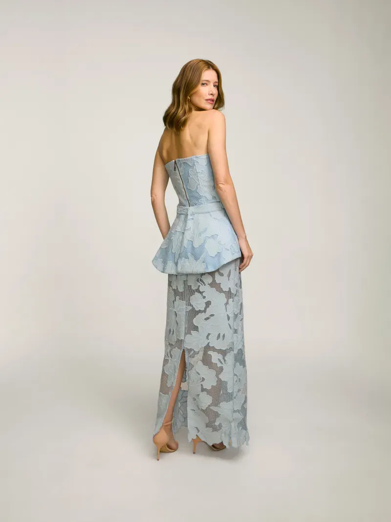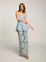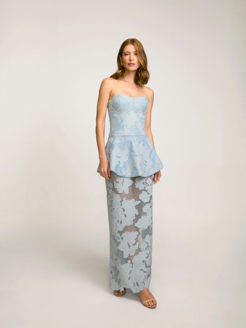 Saia longa confeccionada em tecido especial floral texturizado com transparência. Possui modelagem reta com cintura alta e detalhe de fenda nas costas com fechamento por zíper invisível.
