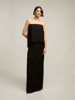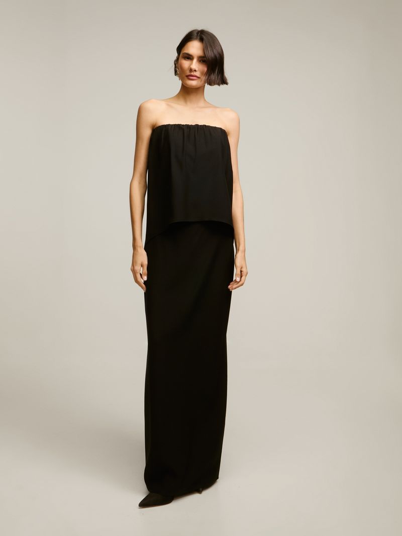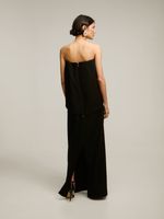 Saia longa confeccionada em crepe patou. Modelagem reta, cintura alta e detalhe de fenda nas costas. Fechamento por zíper nas costas.