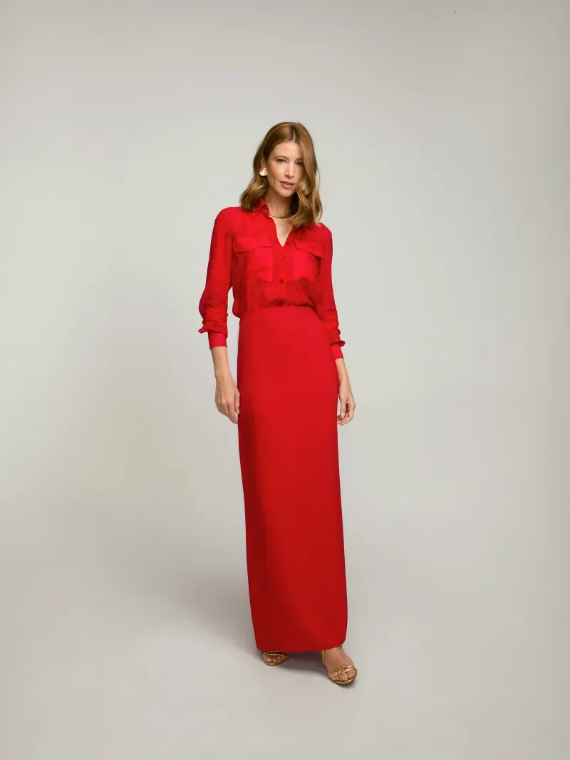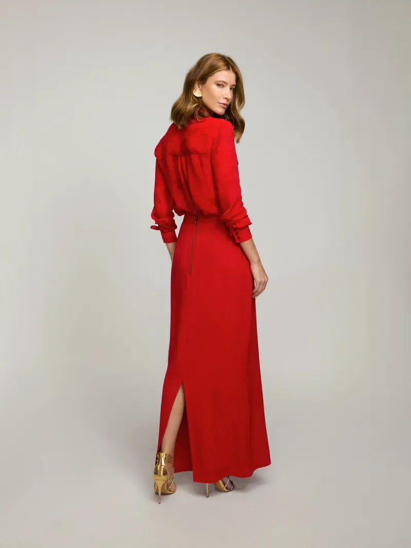 Saia longa confeccionada em crepe patou. Modelagem reta, cintura alta e detalhe de fenda nas costas. Fechamento por zíper nas costas.