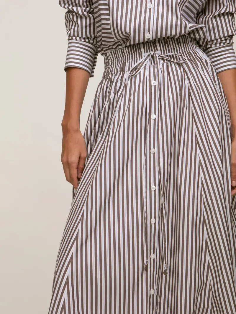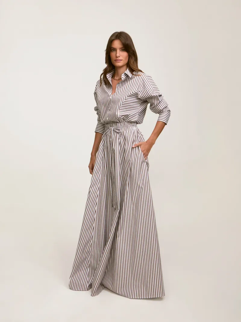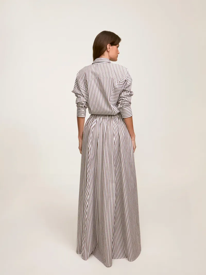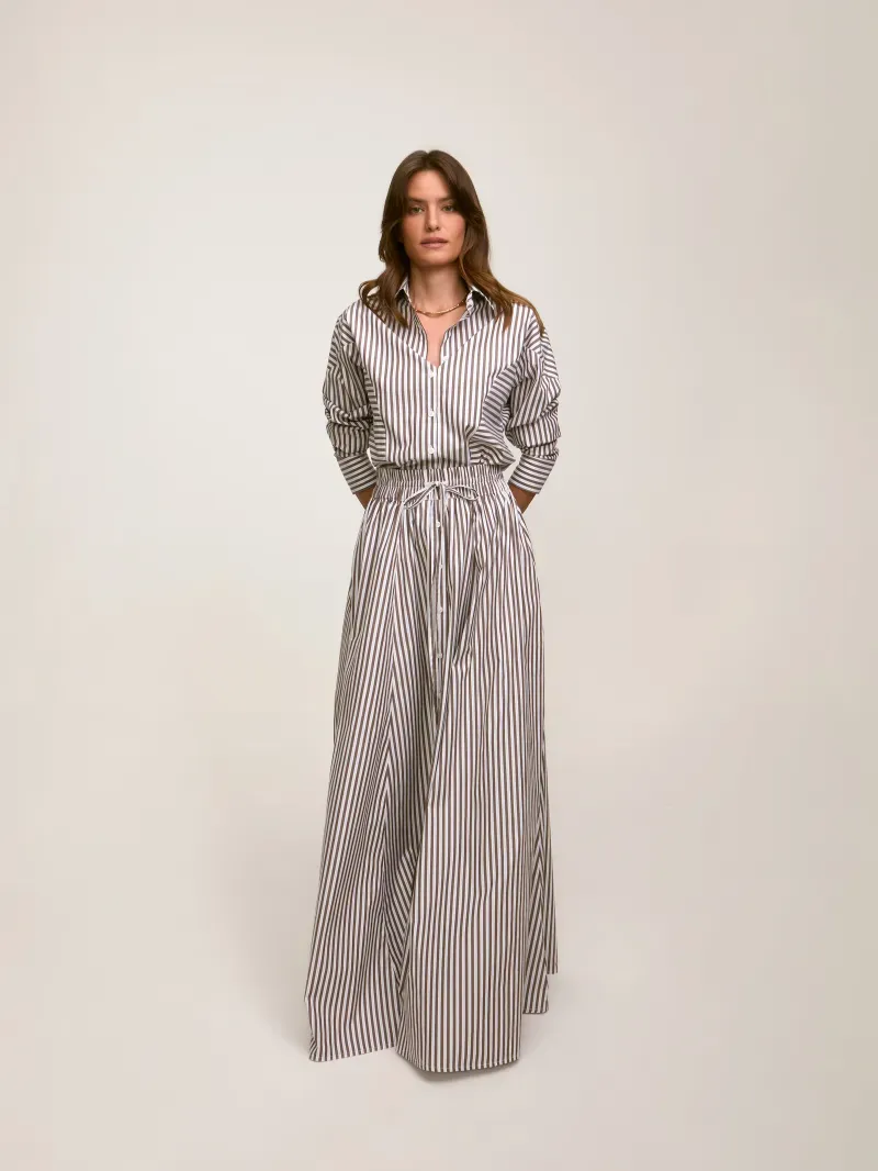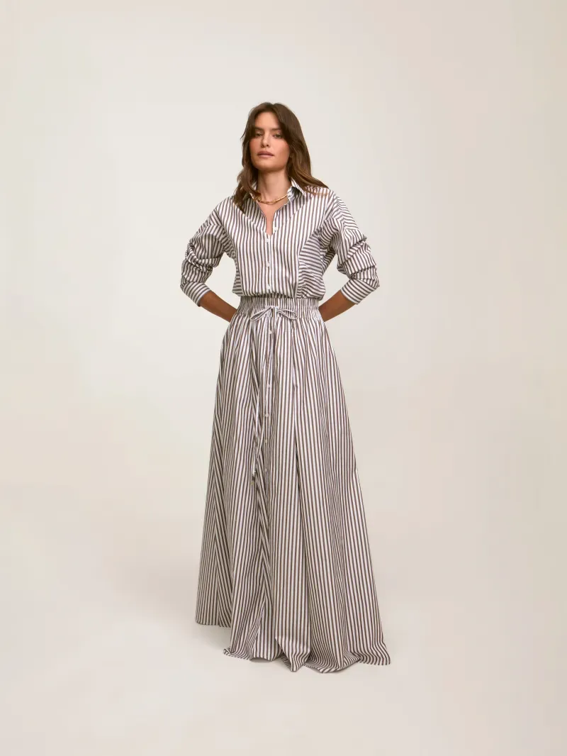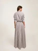 Saia longa confeccionada em 100% algodão. Modelagem ampla, cós com elástico e botões frontais. Detalhe de ponteiras exclusivas NIINI.