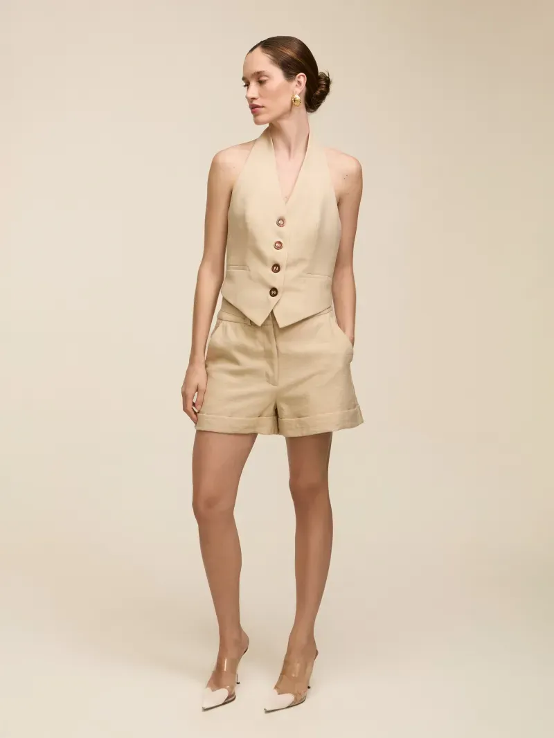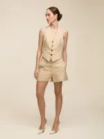 Short confeccionado em tecido de alfaiataria entretelado. Possui modelagem regular com passante para cinto e bolsos laterais e costas. Detalhe de regulagem na cintura permitindo utilizar mais baixa ou cintura média. Fechamento por zíper e colchete de gancho.