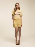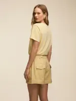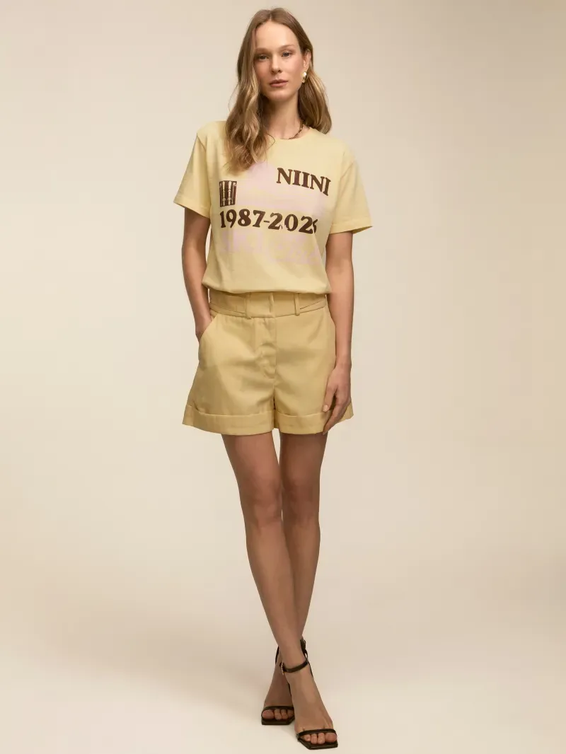 Short confeccionado em tecido de alfaiataria entretelado. Possui modelagem regular com passante para cinto e bolsos laterais e costas. Detalhe de regulagem na cintura permitindo utilizar mais baixa ou cintura média. Fechamento por zíper e colchete de gancho.