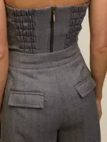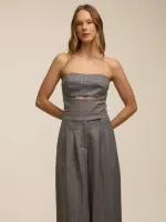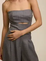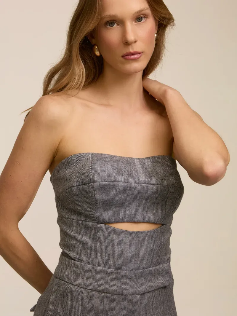 Top cropped sem alça confeccionado em tecido 100% lã. Possui padronagem de "espinha de peixe", barbatanas e fita em silicone no busto. Detalhe em vazado no centro frente e costas com elástico para melhor aderência no corpo. Fechamento em zíper de metal personalizado NIINI nas costas. Peça completamente forrada.