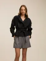 Trenchcoat confeccionado em tecido de alfaiataria, completamente forrado. Não possui bolsos. Possui faixa na cintura para amarração. Fechamento por botões.