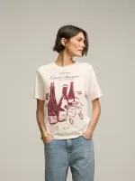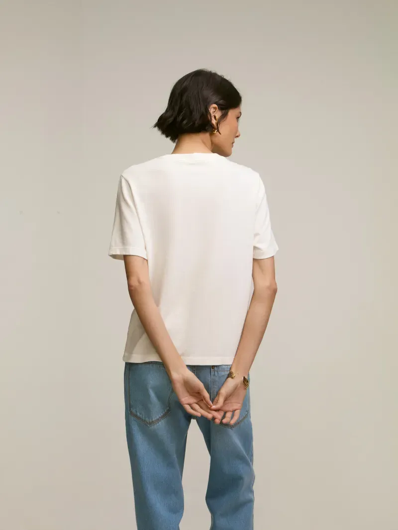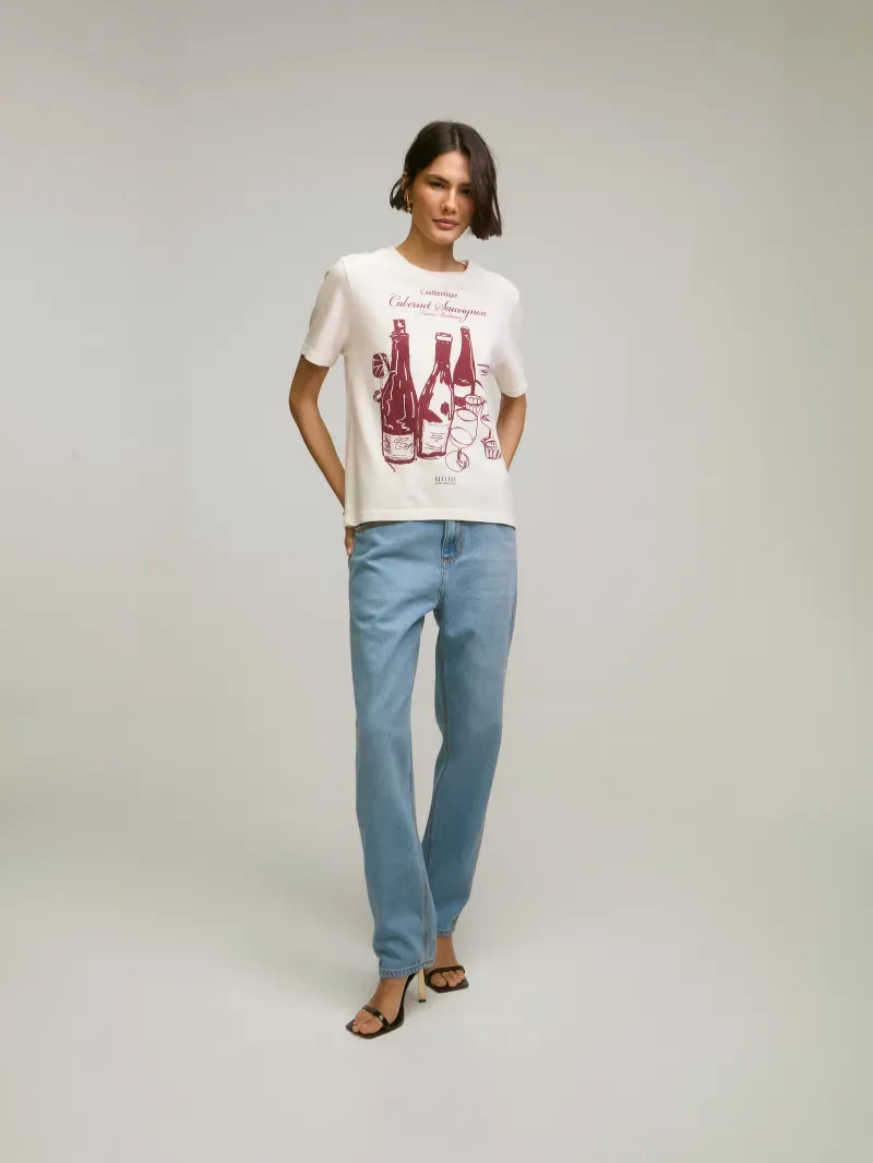 T-shirt confeccionada em malha 100% algodão, com silk exclusivo frontal. Peça com shape regular e manga curta. Detalhe de gola arredondada e rib canelada com leve puído.