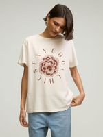T-shirt confeccionada em malha 100% algodão, com silk exclusivo frontal. Peça com shape regular e manga curta. Detalhe de gola arredondada e rib canelada com leve puído.