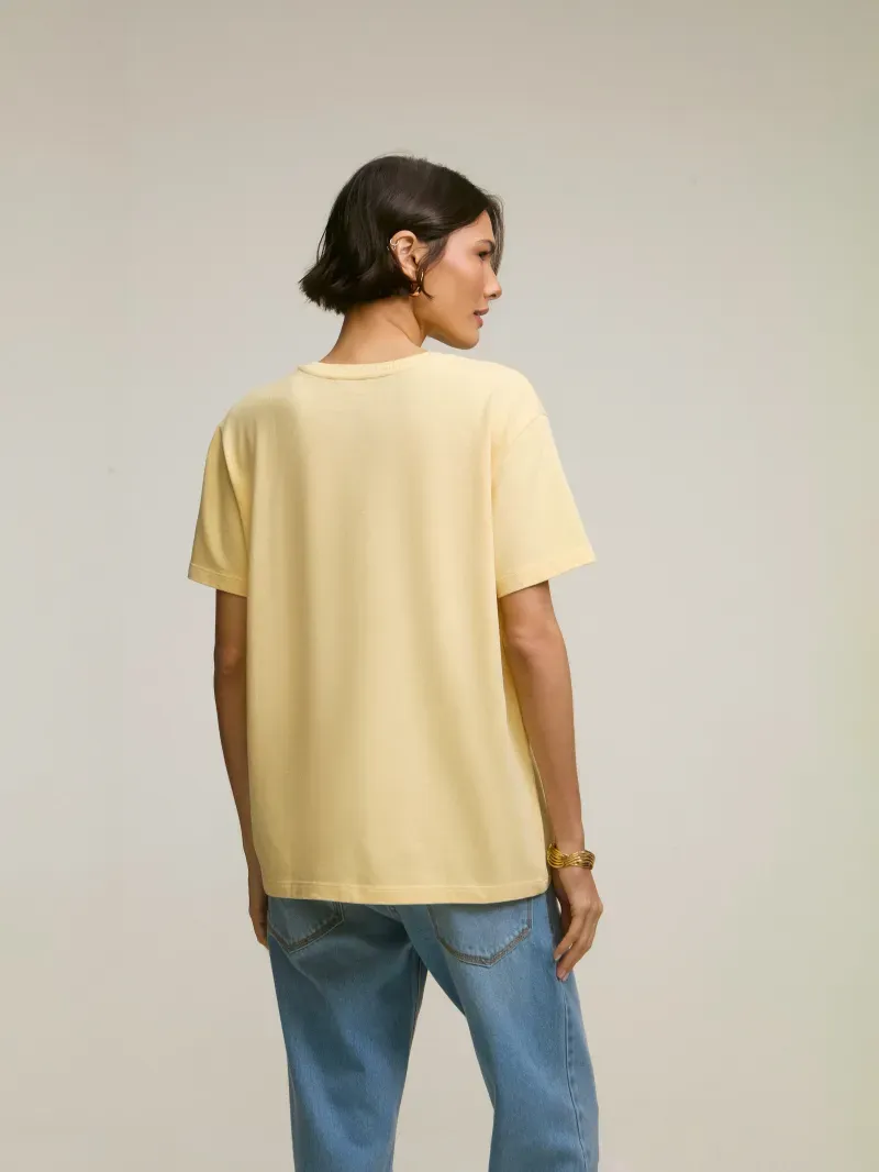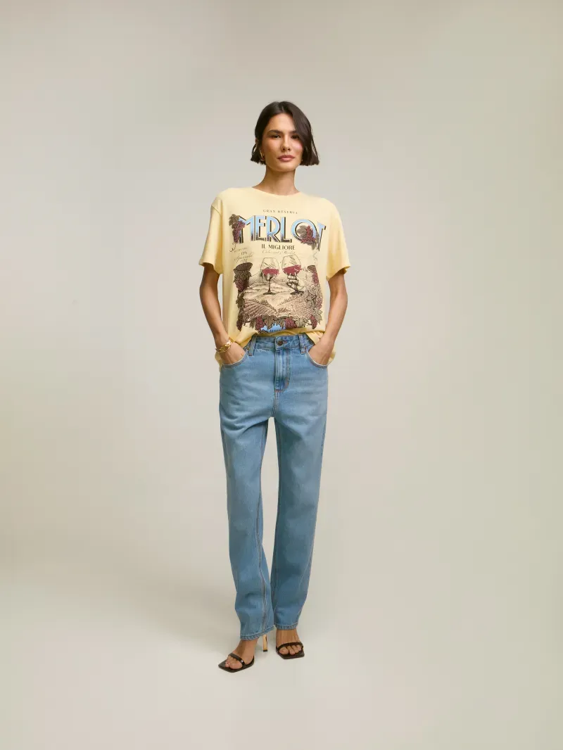 T-shirt confeccionada em malha 100% algodão, com silk exclusivo frontal. Peça com shape regular e manga curta. Detalhe de gola arredondada e rib canelada.