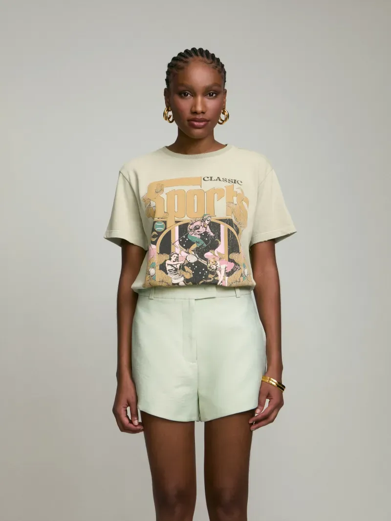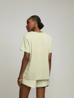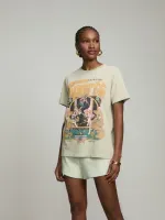 T-shirt confeccionada em malha 100% algodão, com silk exclusivo frontal. Peça com shape regular e manga curta. Detalhe de gola arredondada e rib canelada com leve puído.