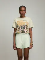 O desgaste do tecido localizado nas bordas e extremidades produzem o efeito puído para trazer o aspecto vintage, assim como nosso método na confecção de estamparia, proporcionando um visual levemente desgastado.