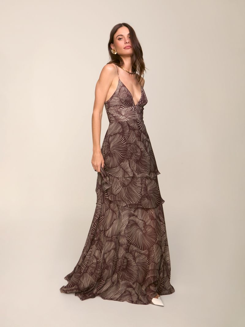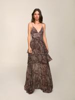 Vestido longo na estampa exclusiva Mushroom Shell. Confeccionado em gerogette, fluído e com leve transparência. Modelagem levemente ajustada, decote v e alças finas. Detalhe de fendas laterais e nervuras. Fechamento lateral por zíper invisível.