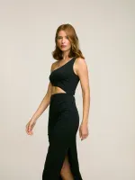 Vestido longo confeccionado em tecido de malha jacquard texturizado, formando padronagem estrelar. Possui modelagem ajustada ao corpo com recortes e vazados assimétricos. Fechamento da gola em botão forrado. Acompanha forro curto.